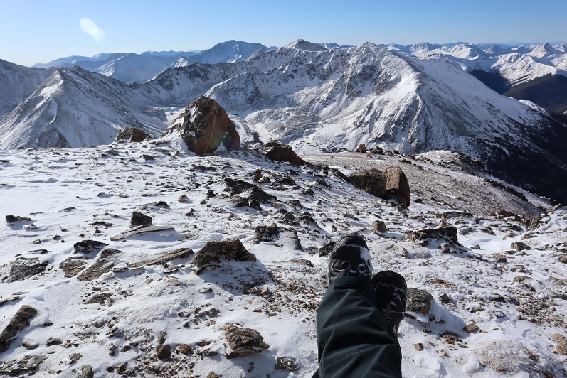 I set up my camera, sat on a snow covered rock and took 1 picture of myself. I was super glad when I got home and saw the picture turned out ok because it was the only one I took (logistics made it difficult to take a picture of myself on this summit). I didn’t see a summit register, but it was probably buried under the rocks and snow.
