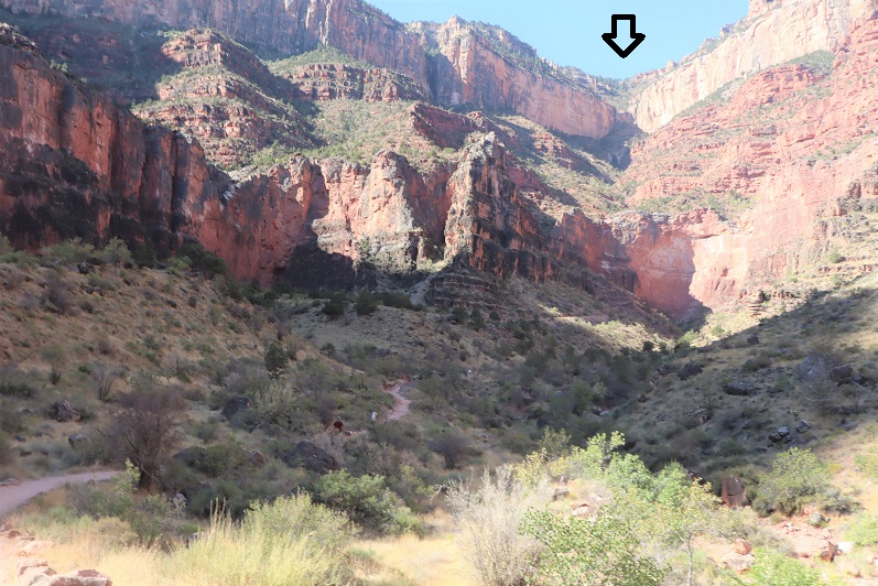 From here there was a sign stating it was 4.5 miles to the South Rim.  With this news I was ecstatic, and after filling up my water bottle I took off towards the rim. The trail is easy to follow, but difficult to see from below.  The trail actually goes to where the arrow is pointing (eventually, after many, many switchbacks).