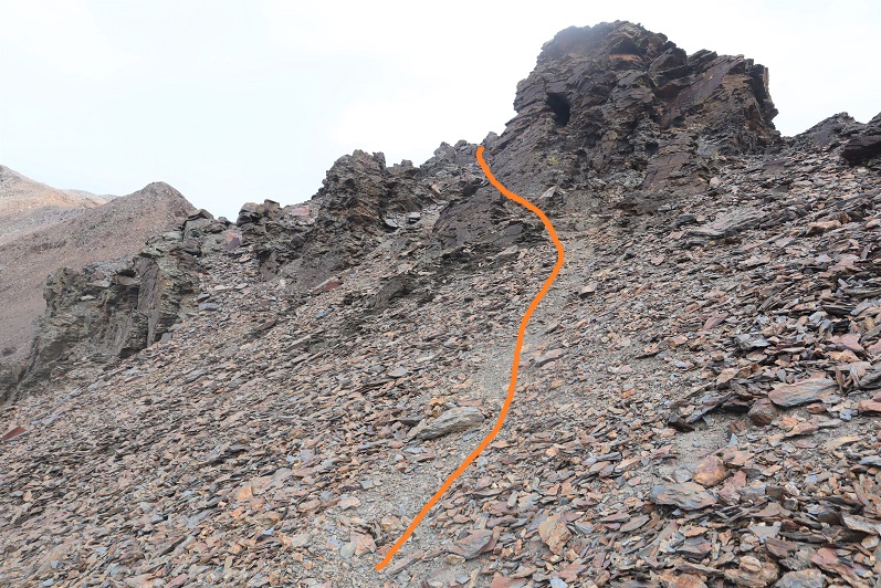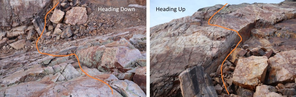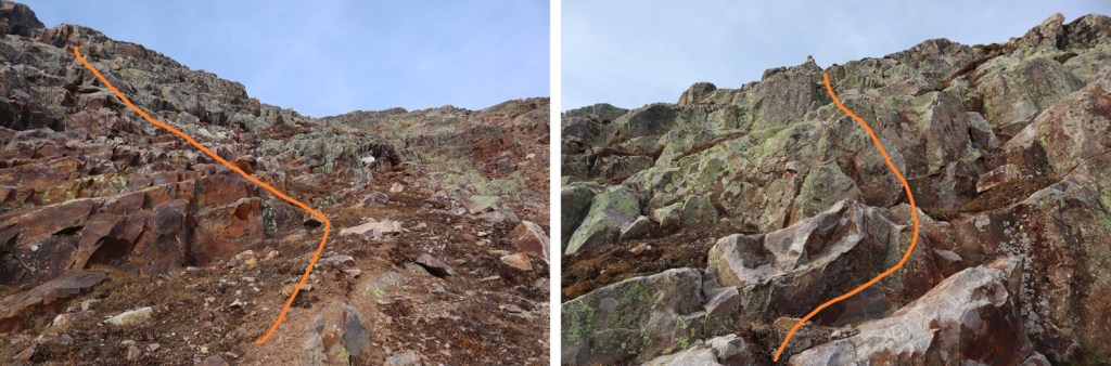 Once out of the ravine I continued southwest across some talus, aiming for another rock band. This was easy to climb up, and there was a cairn at the top, indicating the route to take. This is all class 2/easy class 3. Here are some photos: