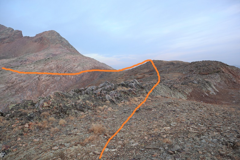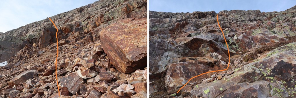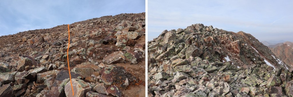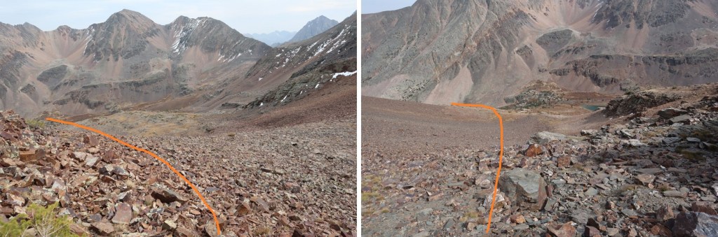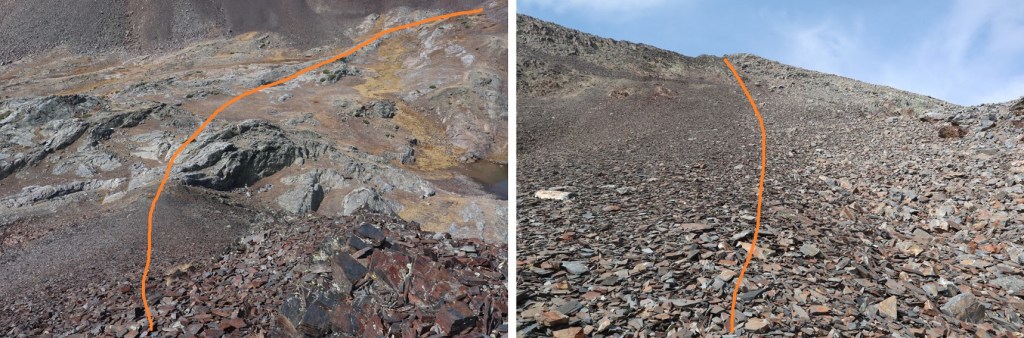 And some step by step photos of my way to Peak Three. After losing approximately 900’ I regained another 800’ to the summit, first by taking a rock rib towards the upper basin, and then ascending using the scree filled gully. The scree here wasn’t too bad.