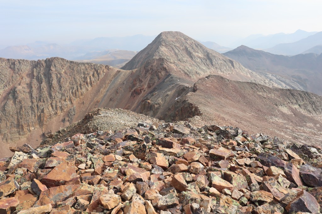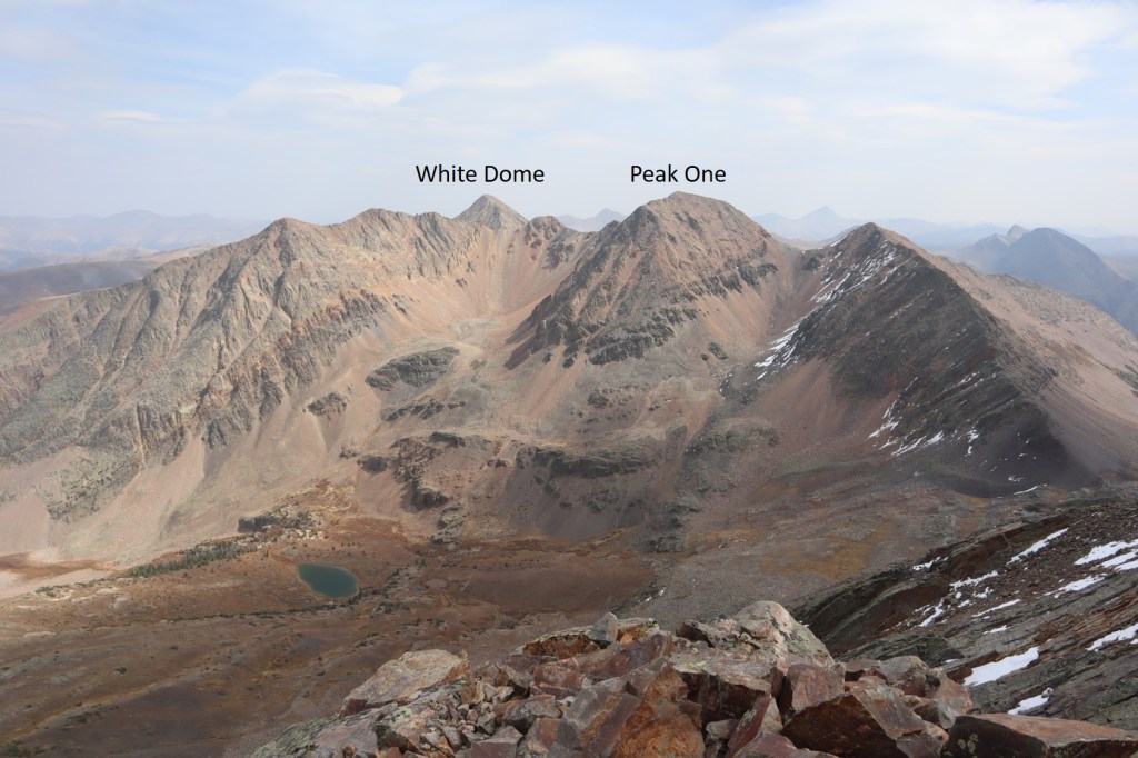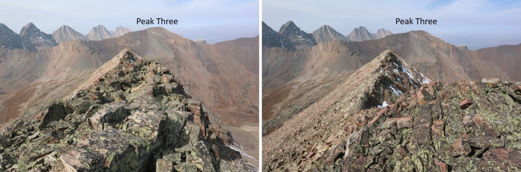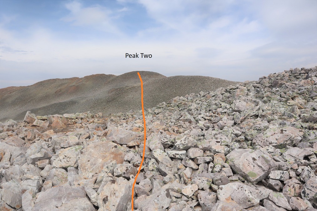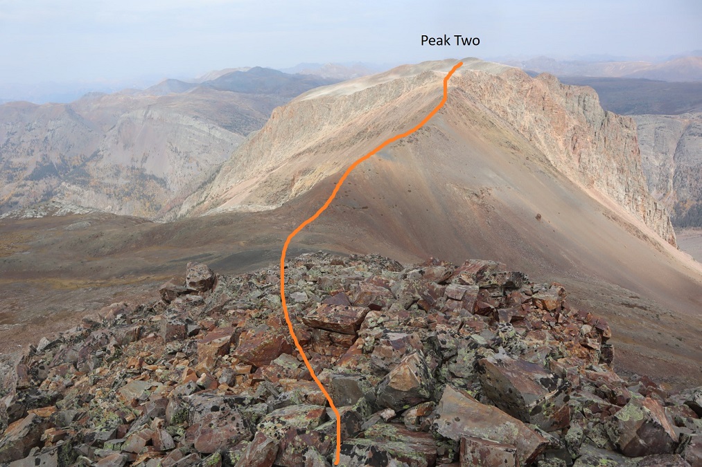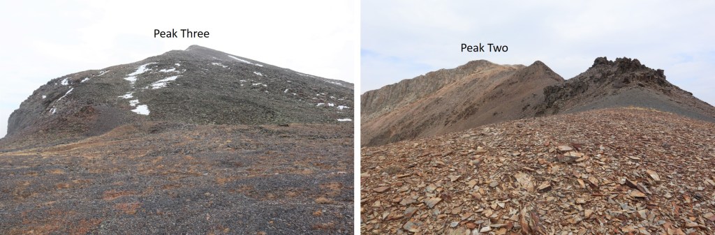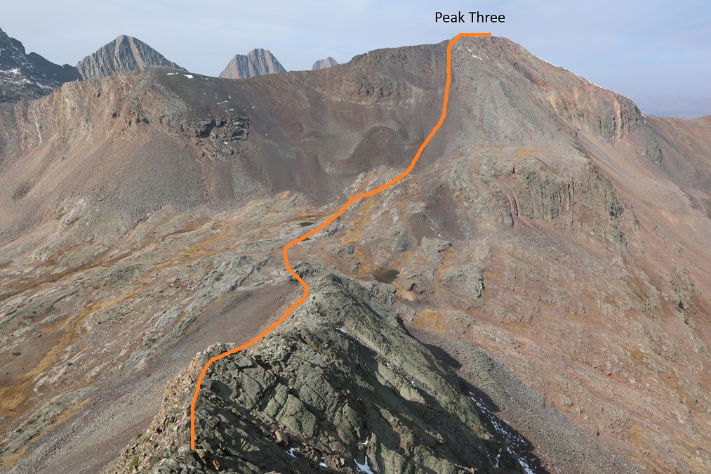Now I had a decision to make. I could either turn back and head for my truck now, or make this a loop. I looked at my stats. I’d only gone 3 miles. Nope, not enough mileage/elevation/work to justify the drive in. I was going to make this a loop and summit Peak 3 and Peak 2 today as well. It would significantly raise my elevation gain (mostly on the way out) but it would mean I would need to make that 1.5-2 hour drive on a dirt road from Silverton one less time. Here’s looking at Peak Three and Peak Two from Peak One, with my overall route there and down into the basin that would lead me out