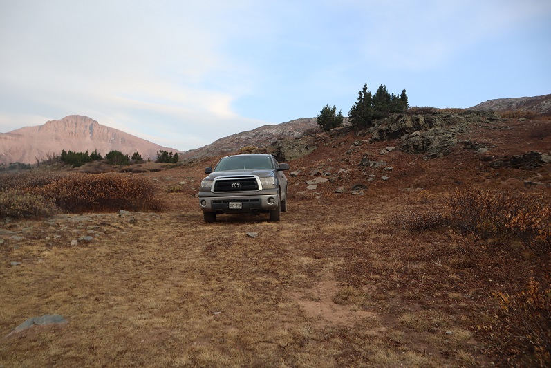 I was in this same area last week, and got a good view of the route I wanted to take to summit these peaks. This weekend the haze from the fires obscured a lot of the photos, but I think I can still get the general description across. I once again drove from Silverton to Beartown, but I decide to drive a little further up the road this time towards Kite Lake. That wasn’t the best idea (the road gets worse as you drive towards Kite Lake) but my truck still made it. She wasn’t thrilled with me, and I’ll be replacing her skid plate this week, but she made it. I drove in and out in the dark, so here are some pictures from last week’s drive.
