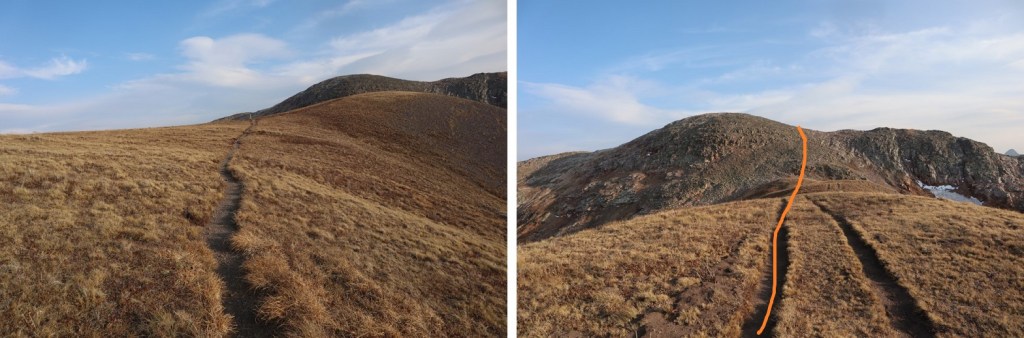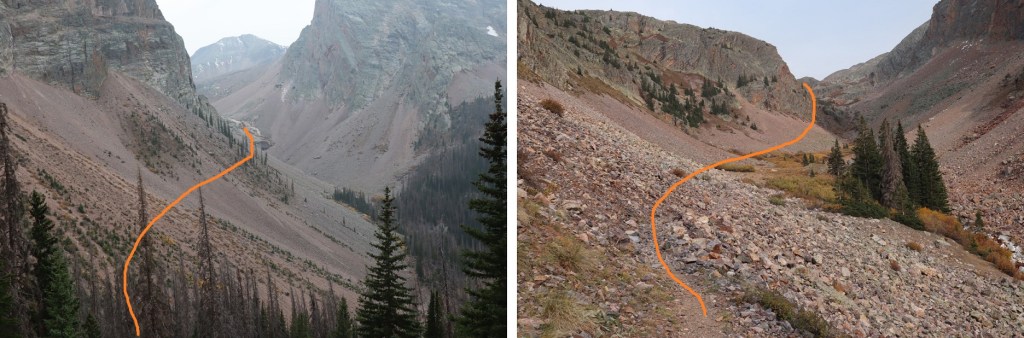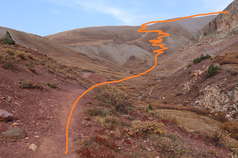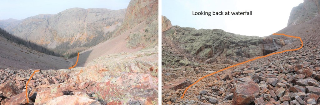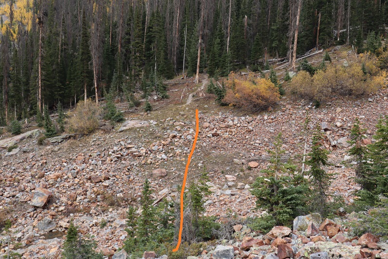 After the waterfall, aim for the trees, pass them to the right, and you’ll be able to see where the Colorado Trail picks up below