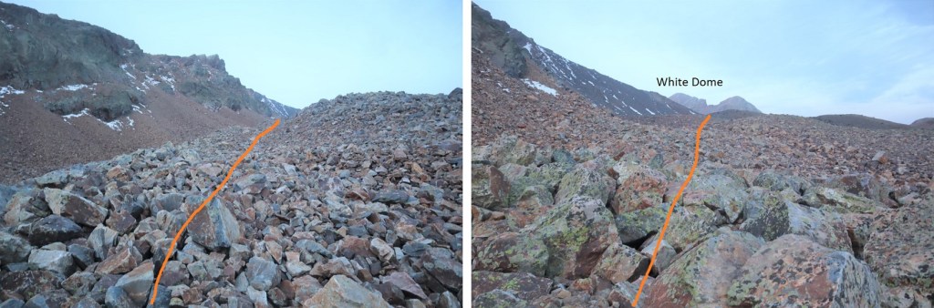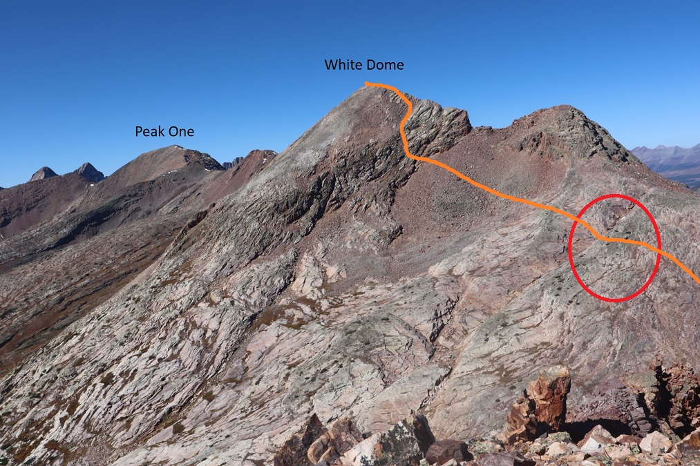 This would bring me to a rocky rib. Here’s an overview of the route up to White Dome, with the rib circled in red (it’s deeper than it looks). The rib drops down about 25 feet, crosses a ravine, and then gains 30 feet. This is class 3, closely bordering on class 4, and the only time I wore my helmet the entire hike.
