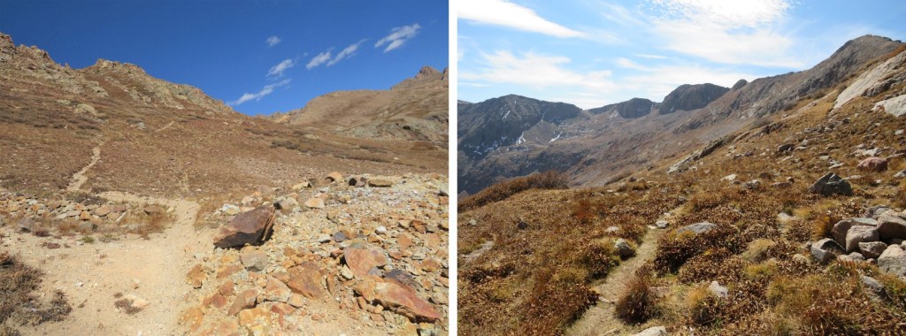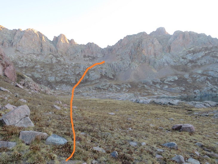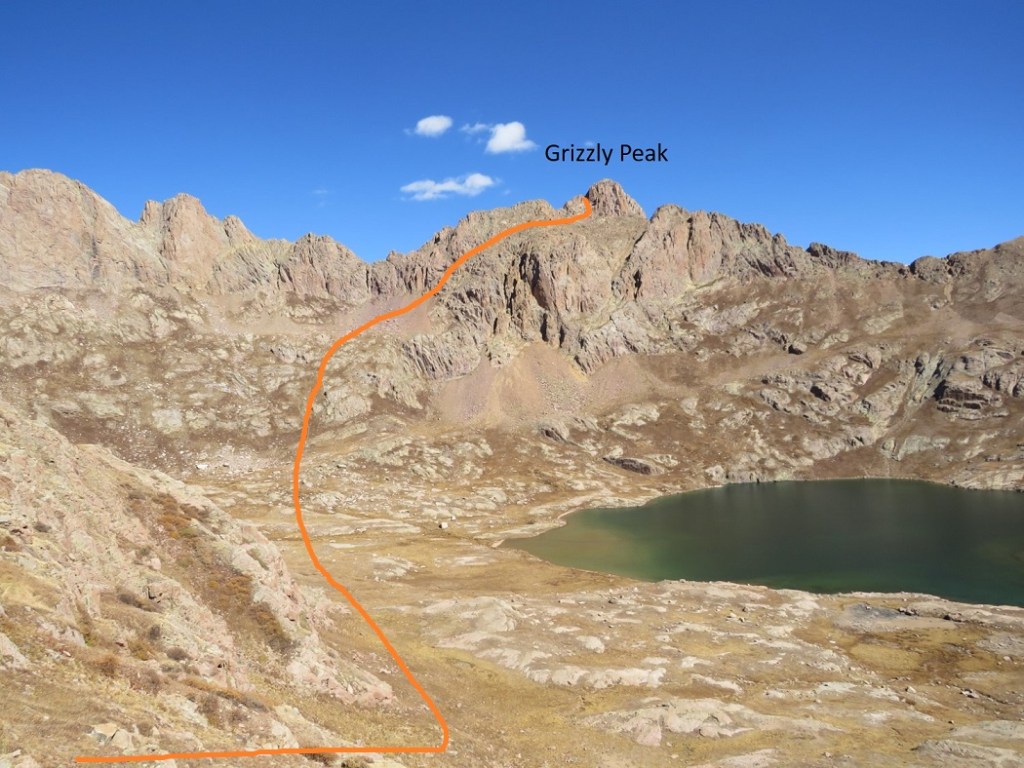 This part of the hike was on a nice trail, and when there wasn’t a trail there were great cairns. From Hope Pass I got a good look at Grizzly Peak C, and the route I wanted to take to gain the ridge. Here’s the overall route I took, aiming for a gully and rock rib that ascends the mountain