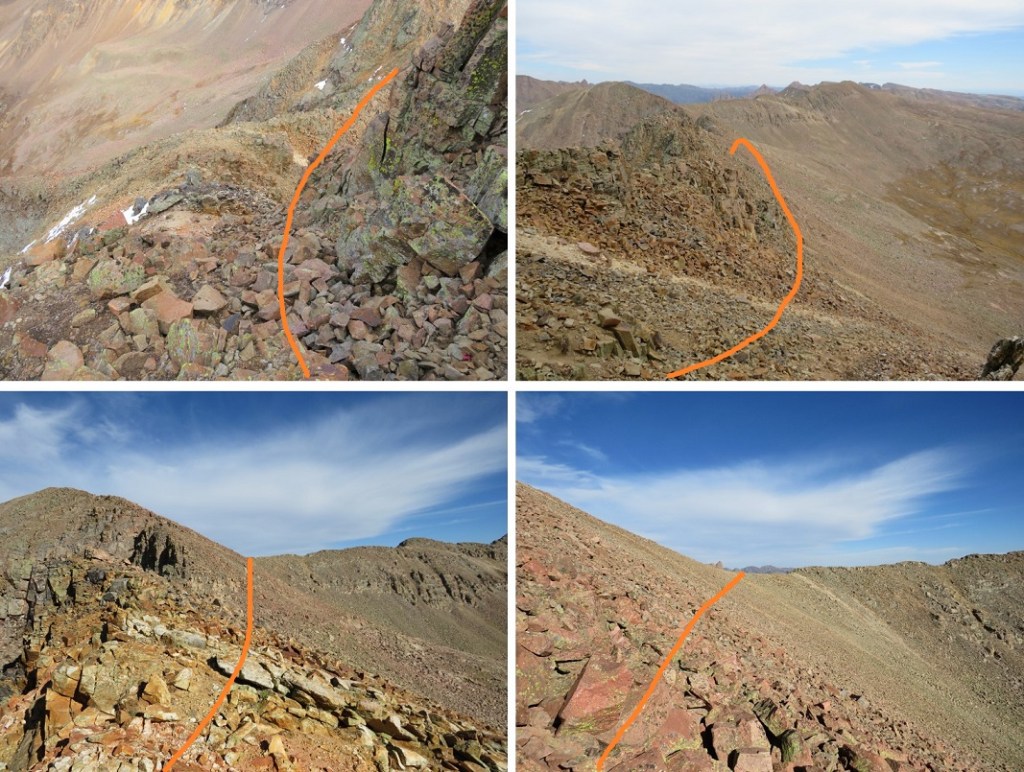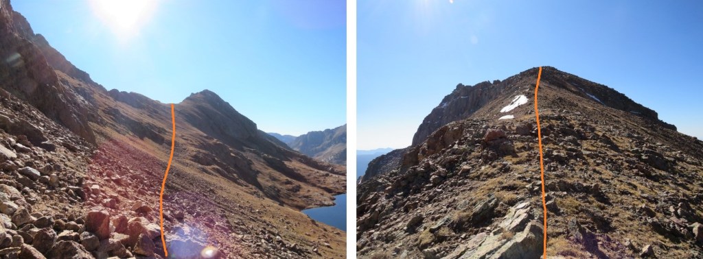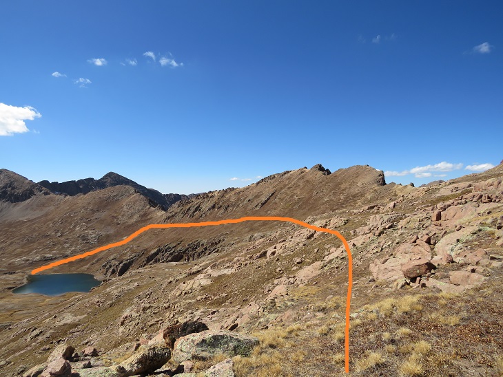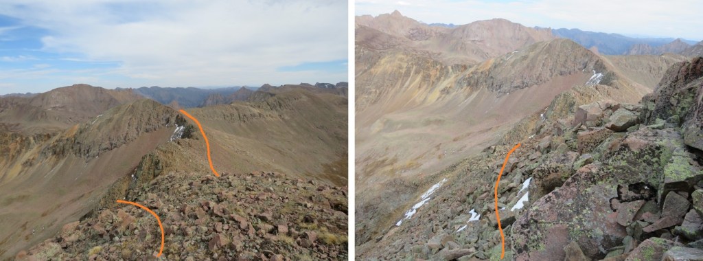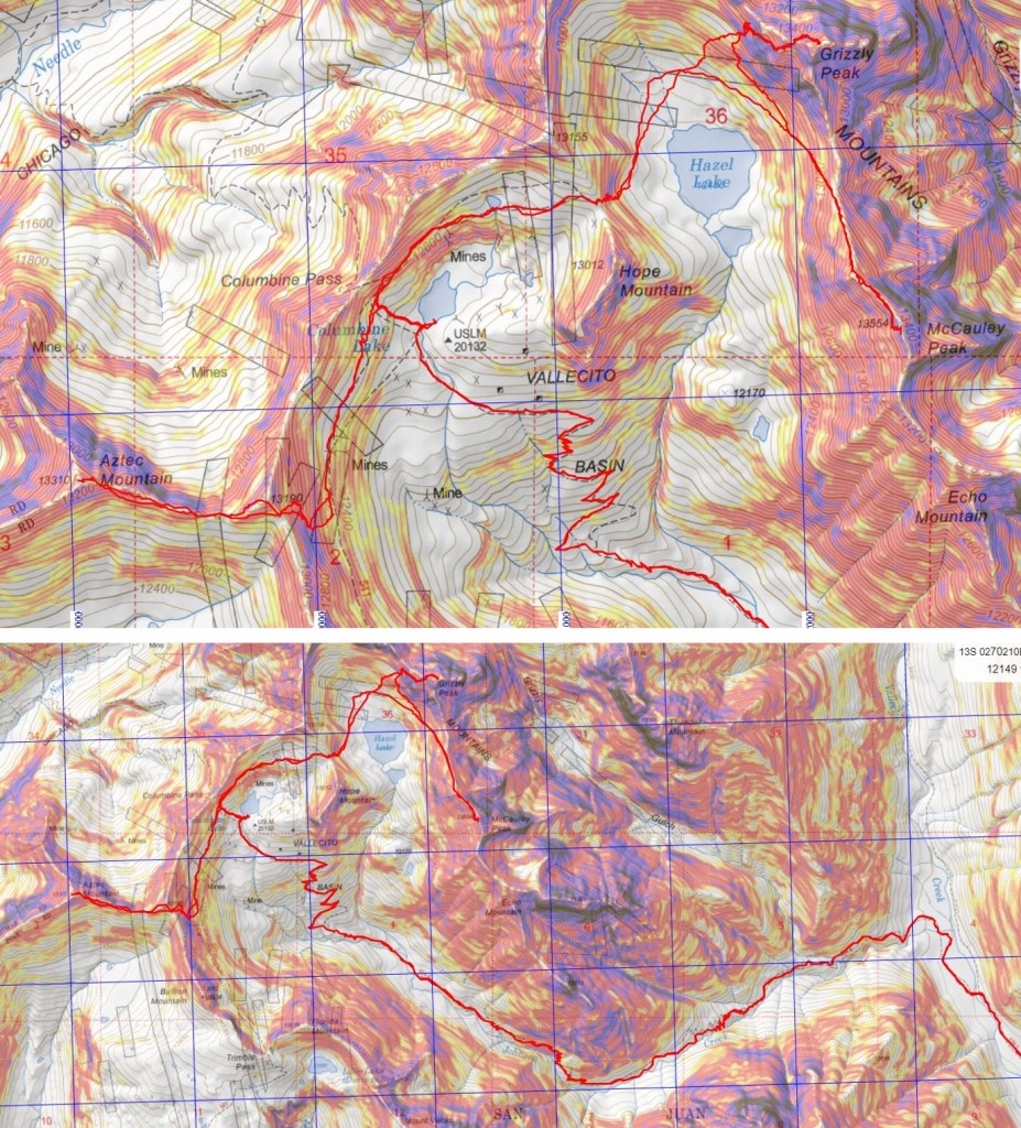 Here’s an overall view of the route I took to the ridge to Aztec Mountain, as seen from Hope Pass the next day