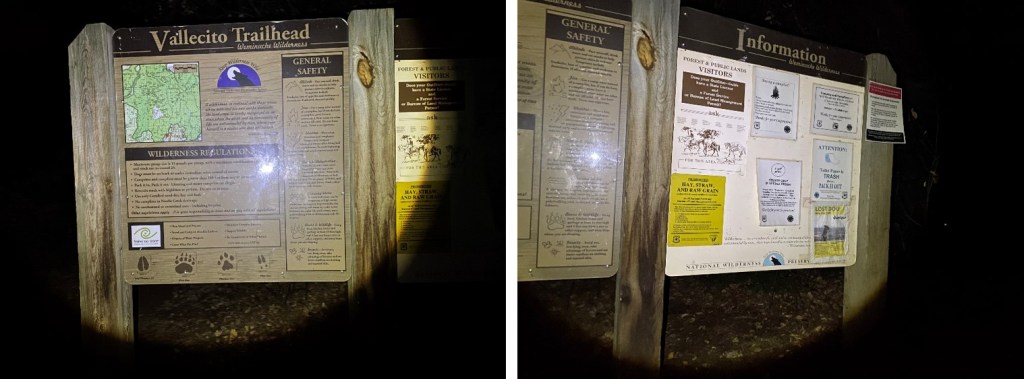 After quite a long drive I made it to the trailhead around 9pm. Just before Vallecito campground there’s a sign indicating trailhead parking is to the left. I parked, and was surprised I had cell service. There were several horse trailers in the parking area, and a few vehicles.