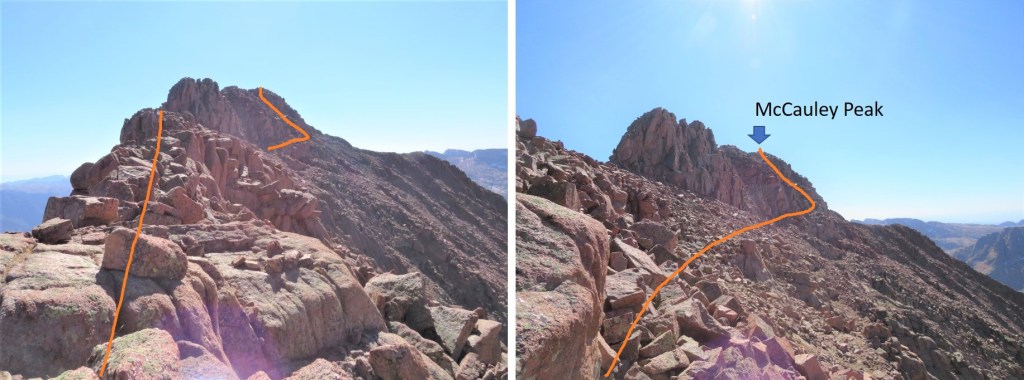 My next objective was McCauley Peak. I could clearly see the line I wanted to take, up the grassy slopes to the Grizzly/McCauley saddle. Staying high didn’t cliff out, but there was one class 4 downclimb required in the area circled in red. If this scares you, you can just go lower initially (the dotted line) and re-gain elevation.