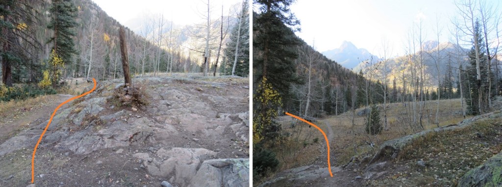 This is a class 1 trail that goes north without any junctions, so it’s difficult to get lost/off track. I crossed the first two bridges (there are actually 3 if you consider the one that leads you out of the campground but doesn’t cross Vallecito Creek), but made it to the third bridge while it was still dark. I couldn’t see across the river, and I didn’t want to cross without a visual, so I laid out my sleeping pad and took a nap for 30 minutes until it got light enough for me to see, then I put on my sandals and crossed the river. I’m glad I waited until daylight: crossing wasn’t too difficult, the water only went up to my knees, but there were pockets/pools where I could have sunk in the water much, much further. My advice is to cross this creek (river?) in the daylight.