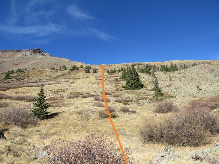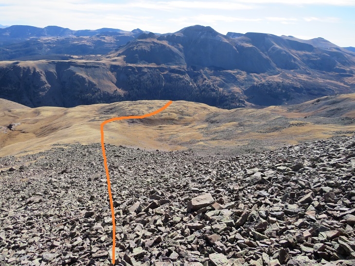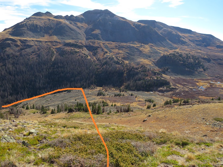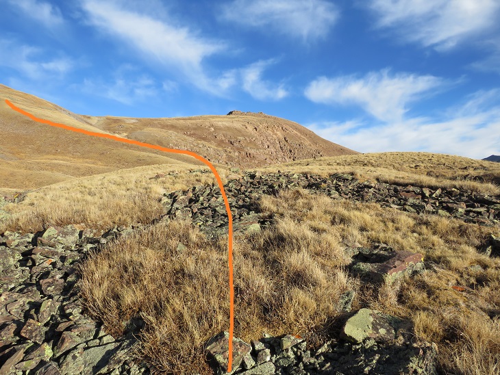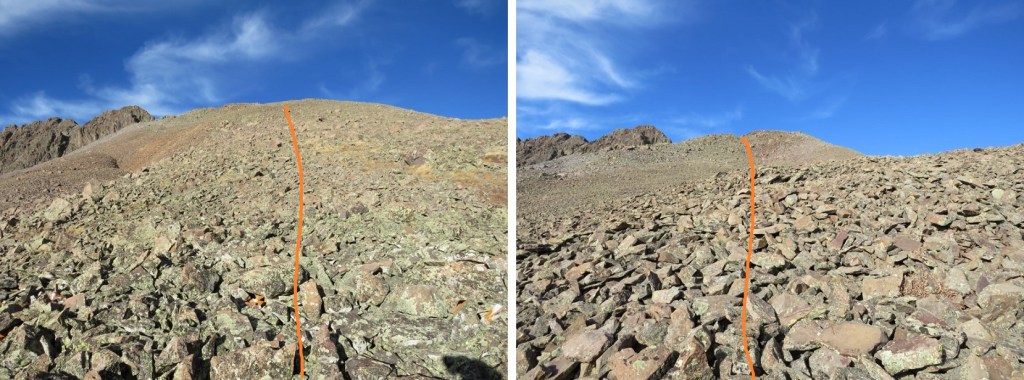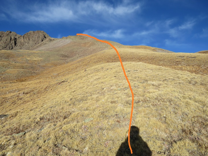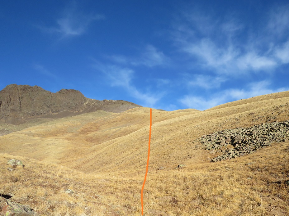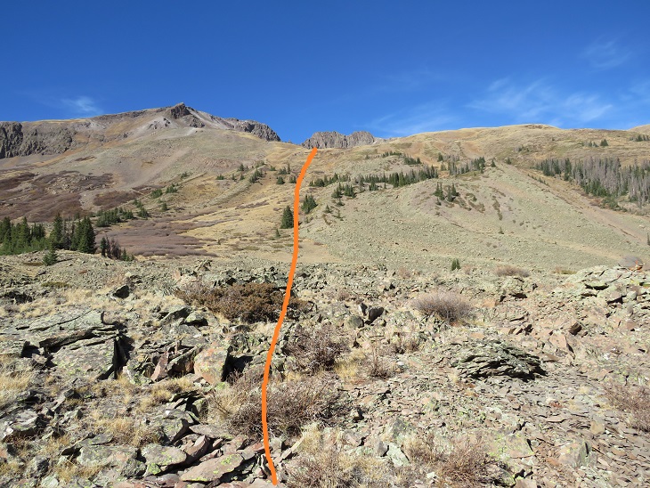 At the top of the boulder field I’d hiked for 3.5 miles. Here I turned right and headed west up the slope. Here’s an overall view of the route. There are many ways to do this, the goal is to gain the upper basin.