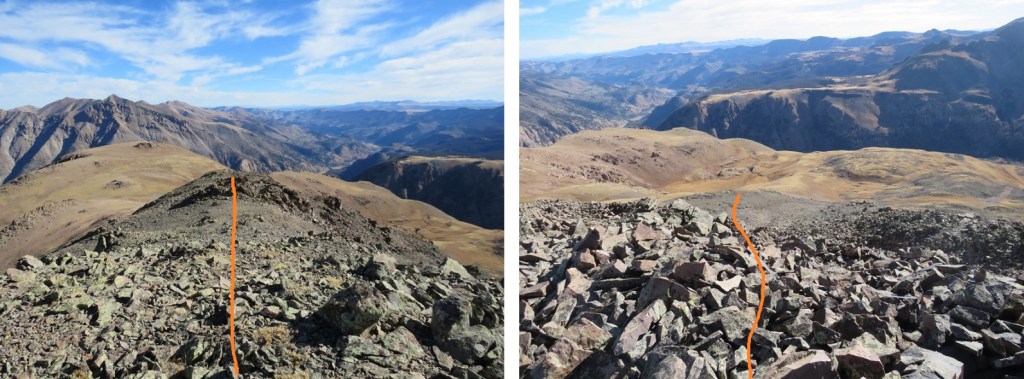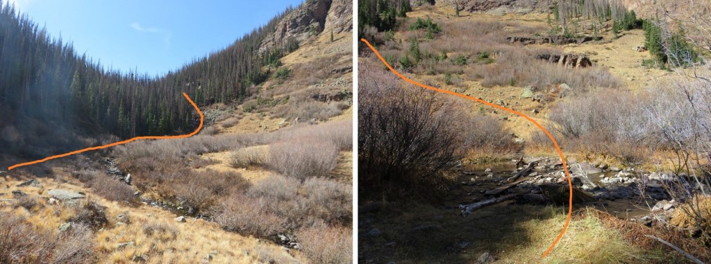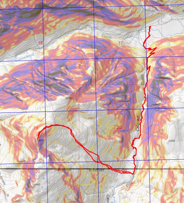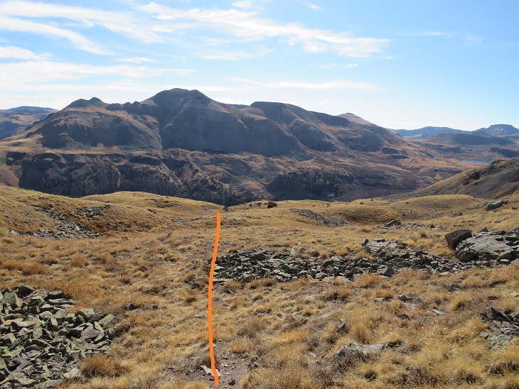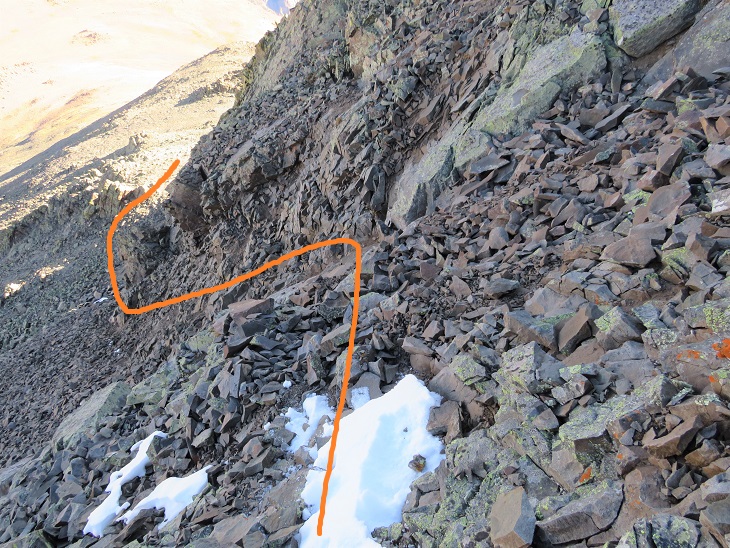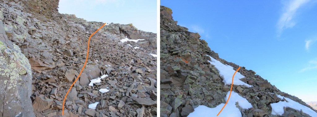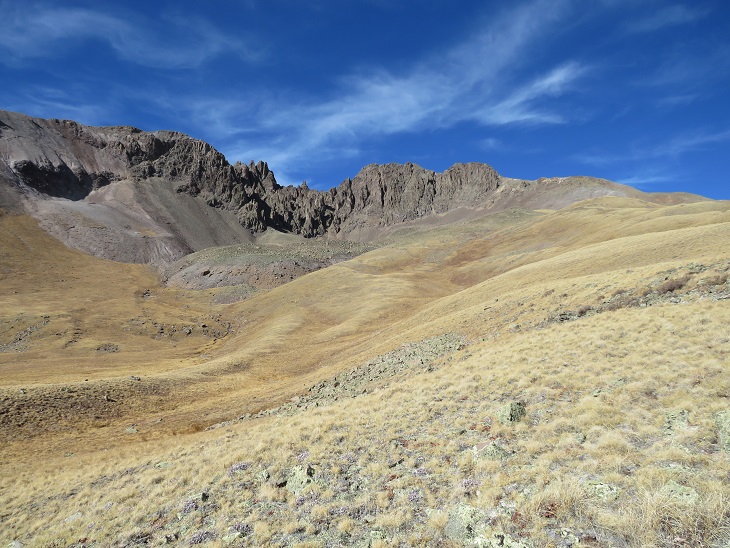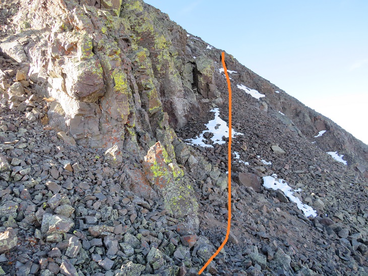 At the top of the boulder field I’d hiked for 3.5 miles. Here I turned right and headed west up the slope. Here’s an overall view of the route. There are many ways to do this, the goal is to gain the upper basin.