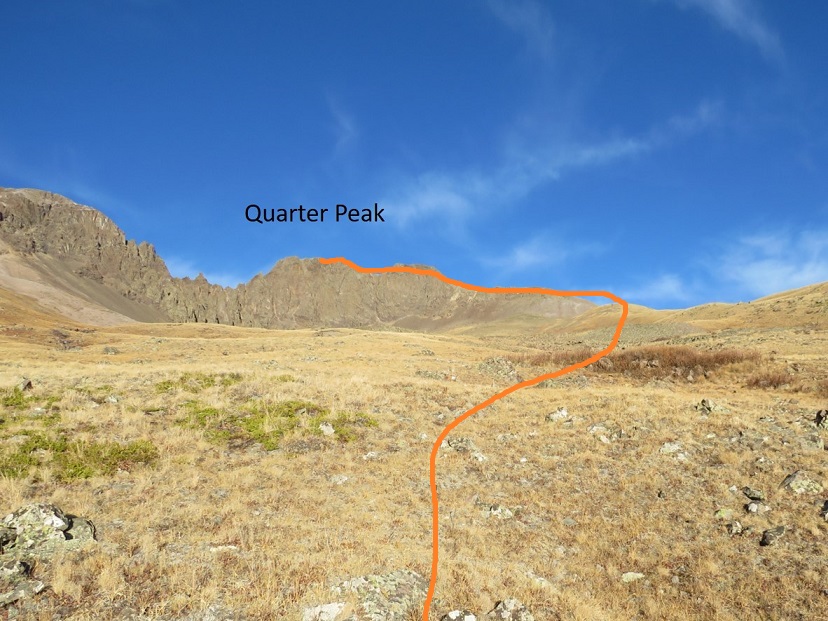 At the top of the hill the tundra started rolling. Here you can see Quarter Peak, and the overall route to get there