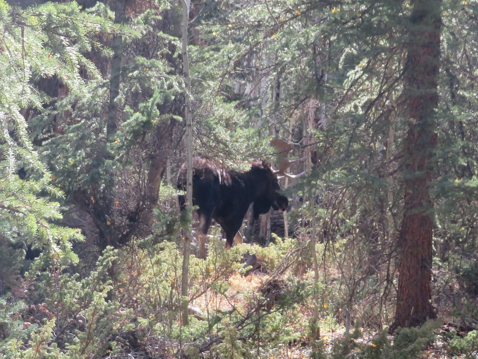 I signed out of the trail register (I’d been the only one to sign it in the past week) and was almost back to the trailhead when I heard a loud rusting. I stopped and turned to my right. No more than 10 feet away from me was the biggest bull moose I’ve ever seen! He was just as startled as I’d been and quickly ran to the cover of denser trees. I gave him plenty of room, and he kept his back to me, so this was the best picture of him I was able to get.