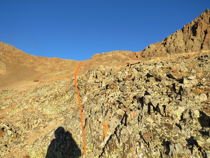 I came to the area that had stumped me last time and was pleasantly surprised to find the depression/bowl wasn’t as deep as it had appeared to be with snow.   It was a little steep, but an easy trek across this section and up the gully to the upper basin