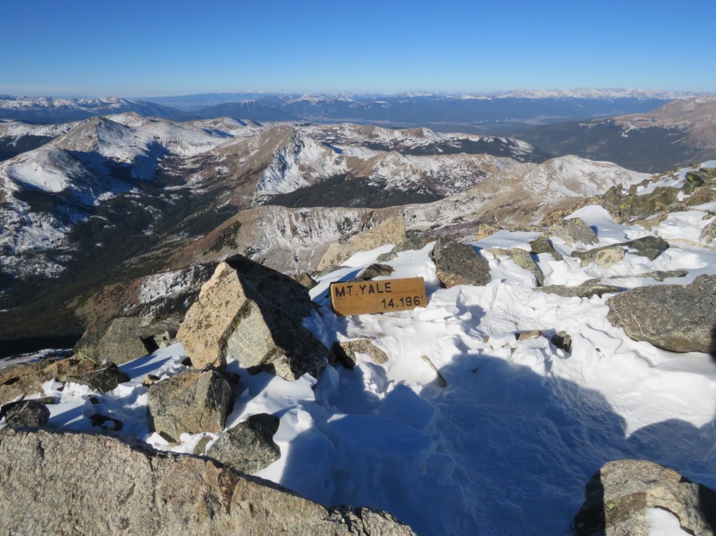 I summited Mt Yale at 8:20am. There was a sign at the summit (I don’t remember it being there last time I summited, and I’m surprised no one has taken it back down/hidden/destroyed it yet)