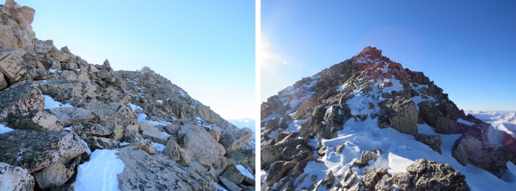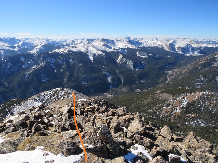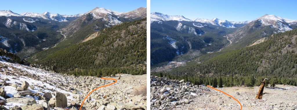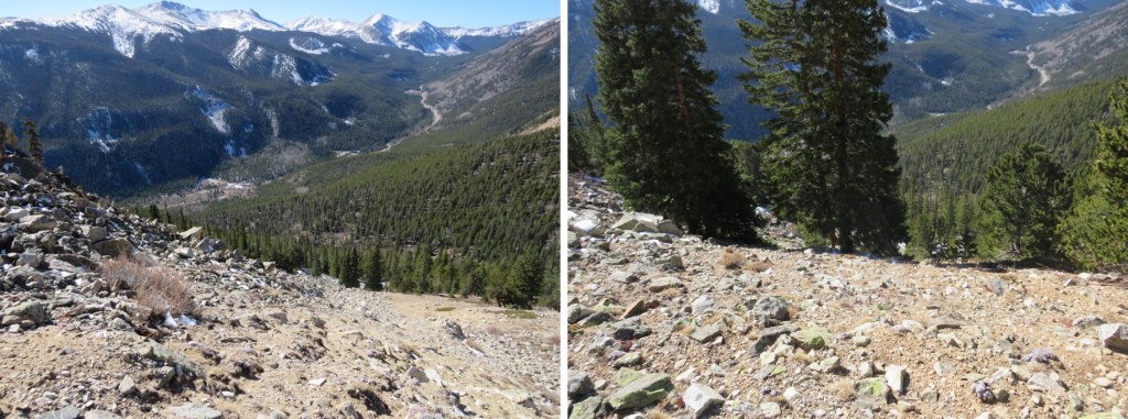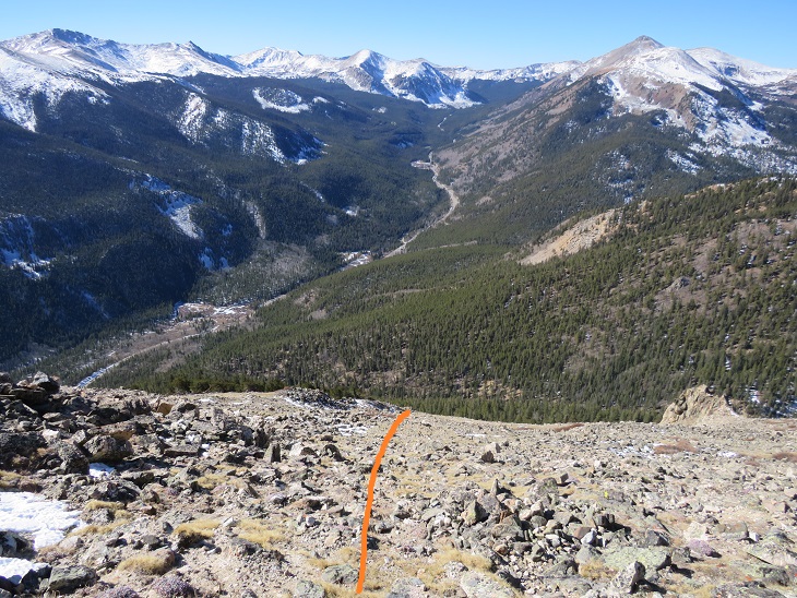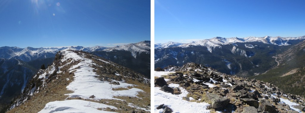 I was making this a loop today, so after a few pictures I continued southwest down the ridge. I stuck to the top of the ridge. There’s a great view of Cottonwood Pass until you get to treeline, so as long as you stay on the ridge it’s difficult to get lost.