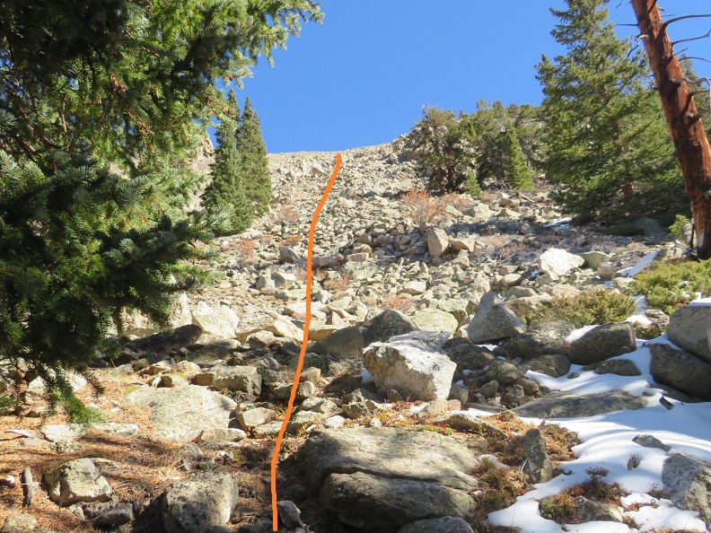 Just before treeline I left the ridge and headed right (west) down what could loosely be called a gully.