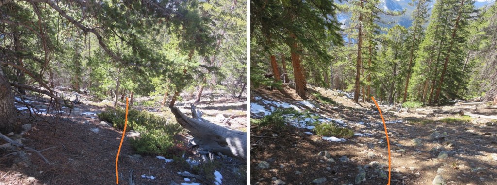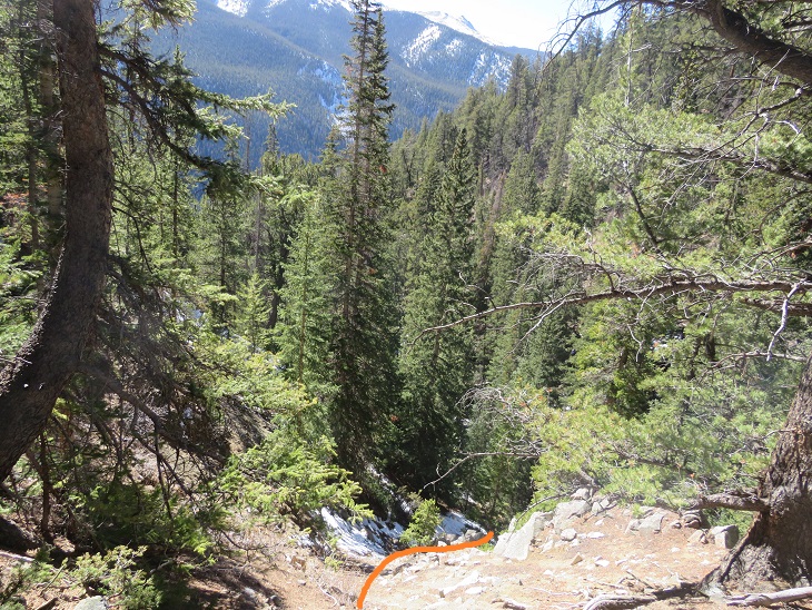 I kept following the obvious curve as it headed to treeline (no trail here, just keep taking the path of least resistance towards Denny Gulch)