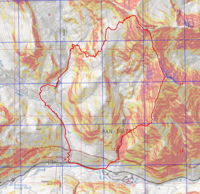 Here’s a look at my route from Mt Yale from the Yale/Mascot saddle. The snow at the top was more troublesome than it looks. There also seem to be several ways to descend to the saddle.