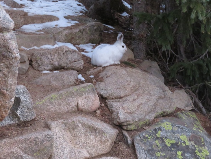 I saw a rabbit directly on the trail. This rabbit didn’t seem to mind my presence, and refused to move/run away until I was about 2 feet away from it. It ran and ‘hid’ under a pine tree, but since it’s now white I had no trouble seeing it behind the branches.