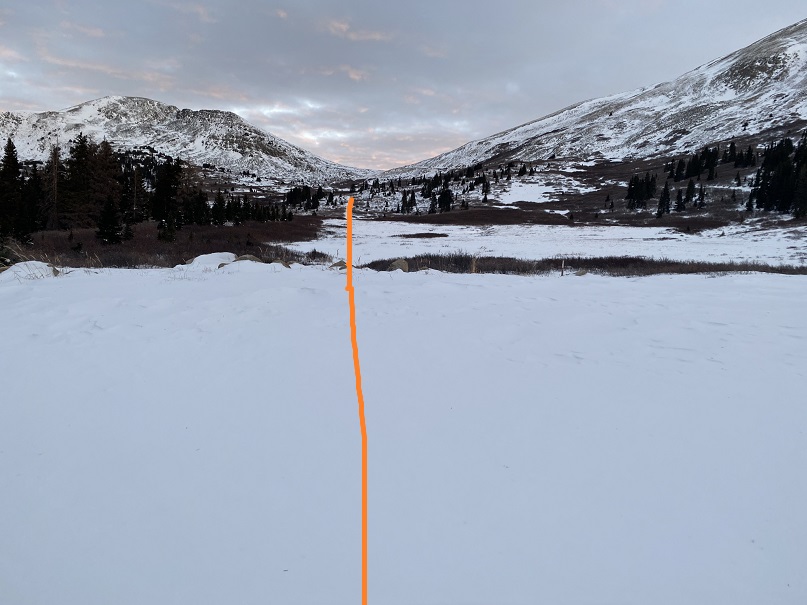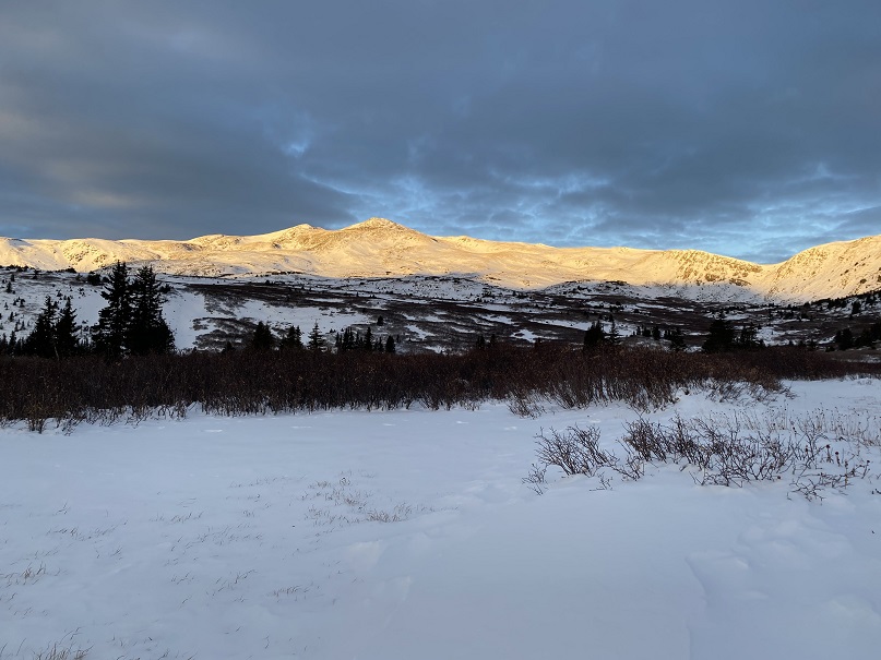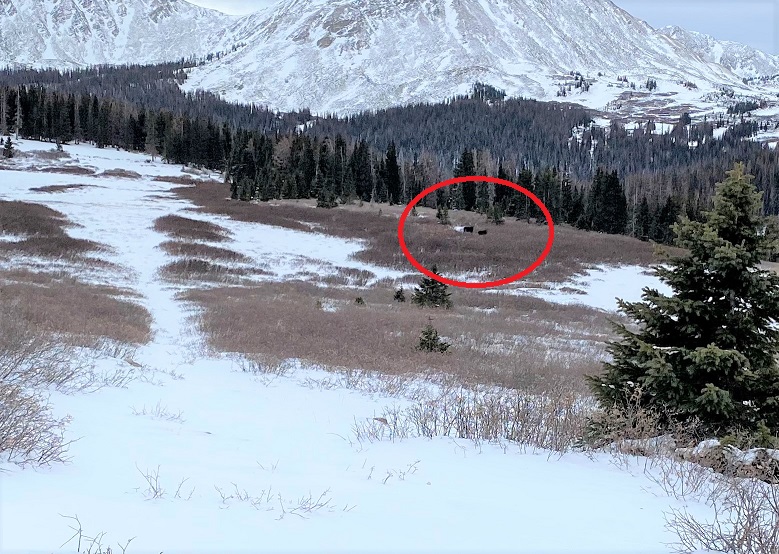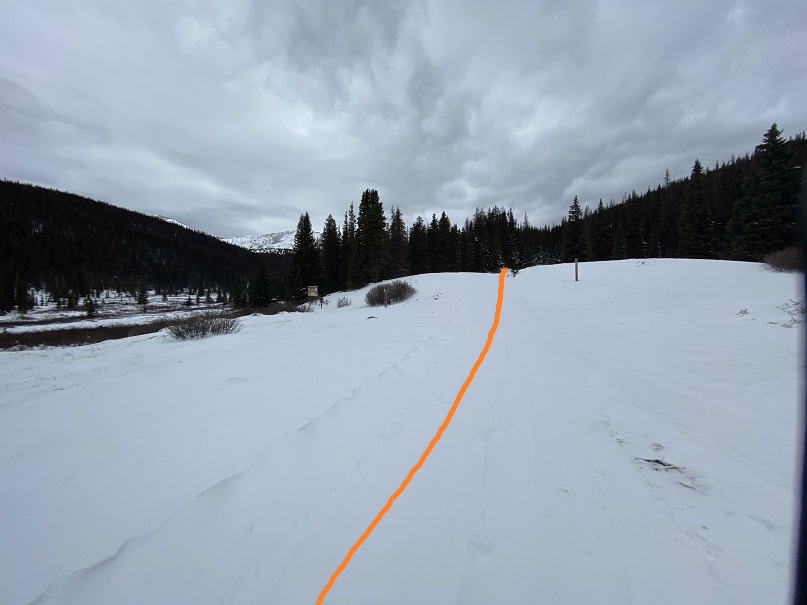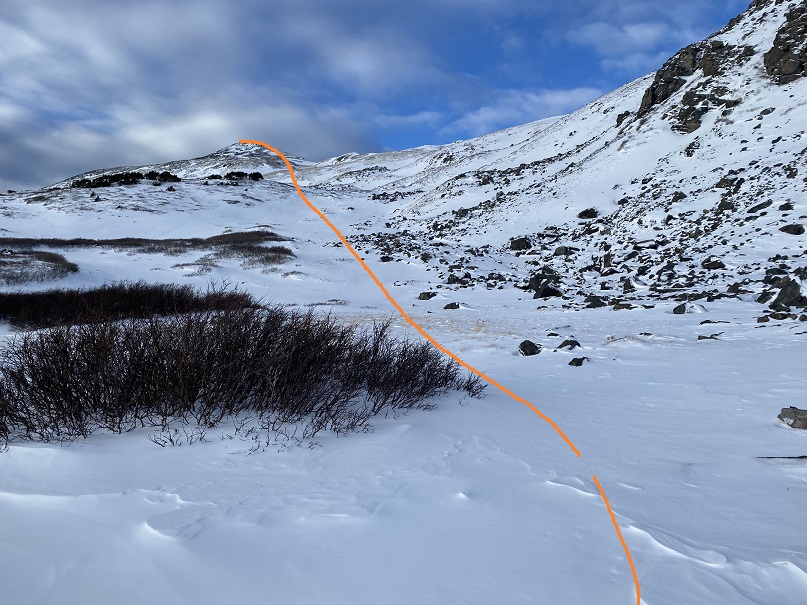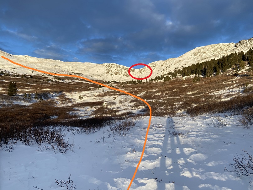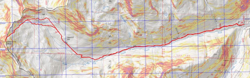 As I hiked I changed today’s hiking plans.  Originally I’d planned to hike Emma Burr, but I could see by looking at the clouds the winds were intense above treeline, and the snow was coming in much earlier than predicted (4pm was when they were slated to start, but by the looks of it, it would be snowing before noon).  I had several options today, and chose instead to summit Fitzpatrick Peak.  I believe this is traditionally done by gaining Tincup pass and following the ridge (thus getting in a 12er as well), but my visual of the winds told me my Raynaud’s would balk at a windy and cold ridge hike today.  So, instead I decided to make this a visual hike and hike up the west side of Fitzpatrick Peak, staying below the ridge and thus avoiding the brunt of the wind.  Here’s my overall route.  In red I’ve circled an obvious trail, but it led to a cornice I didn’t feel comfortable attempting today.