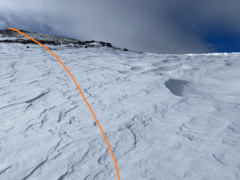 I gained the ridge at the last possible point.  Here I encountered fierce winds and sastrugi.  It had been a good idea to stay low for so long.