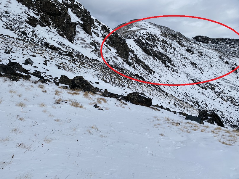 This is a very visual, not a technical hike.  Here are some close up pictures (once again, one of the summer routes is circled, and you can see why I chose to stay low, as there’s a cornice at the end of the route, and cliffs above the exit point around the cornice).