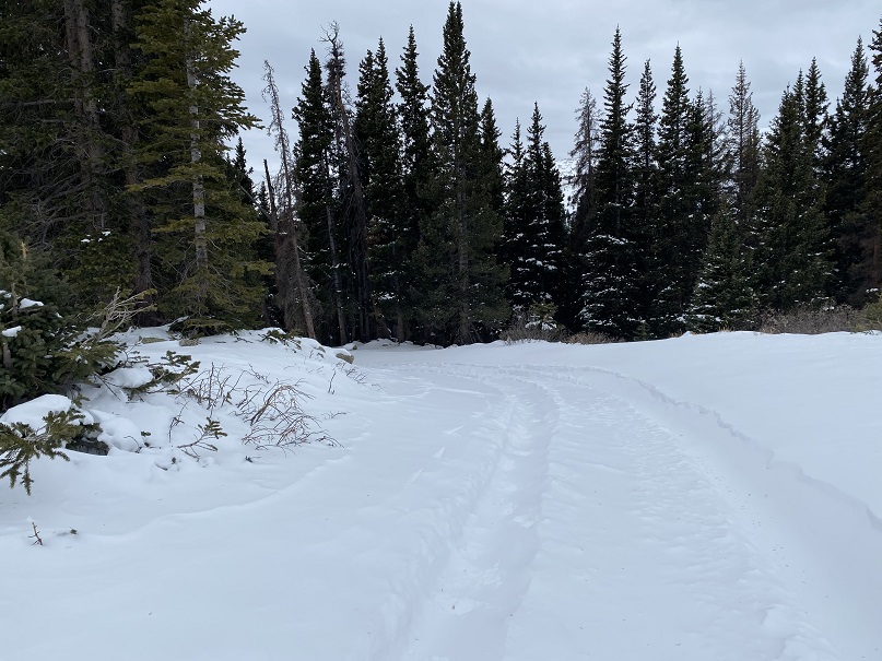 It was now snowing.  Not a lot, but enough to tell me to book it back to the truck.  The weather had certainly come in much quicker today than anticipated.  I was pleased with my choice of Fitzpatrick Peak as an alternate today:  the weather on Emma Burr looked menacing at this point.  I followed the 4WD road back