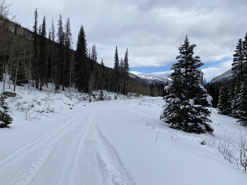 After hiking for 5.15 miles I was in the basin.  My spirits had lifted, and I was now excited to be out hiking today.   The winds had put drifts onto the 4WD road, so I decided to put on my snowshoes and head towards Tincup pass on foot.