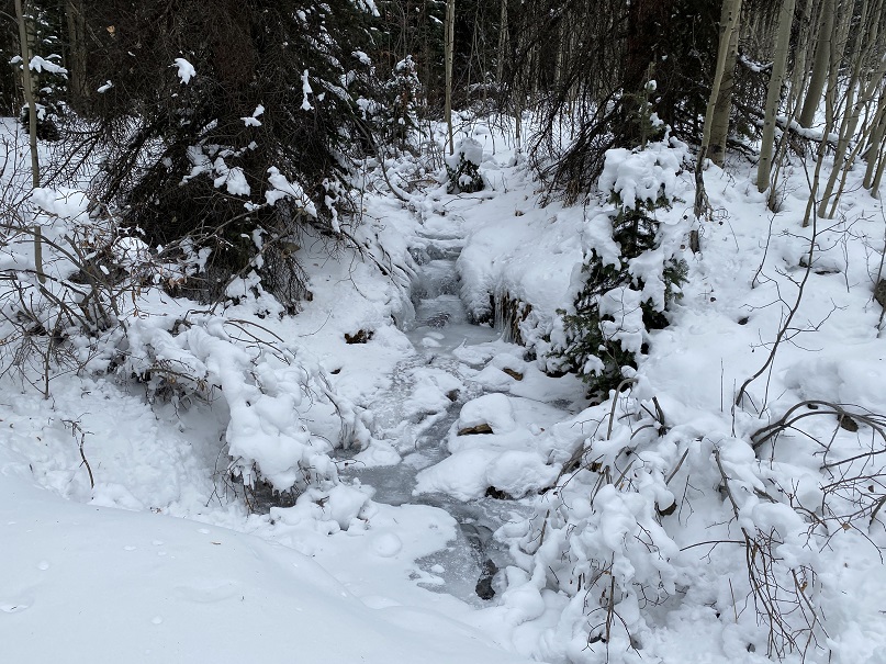 This time, appreciating the streams whose noise had startled me in the dark, and doubly appreciating the lack of snowmobiles:  Last time I was here they zoomed by every 5 minutes or so, and it was obvious they were on a tour and didn’t know how to navigate their vehicles:  I did a lot of jumping out of the way.  Today it was a nice, peaceful hike, and I didn’t see another person all day.