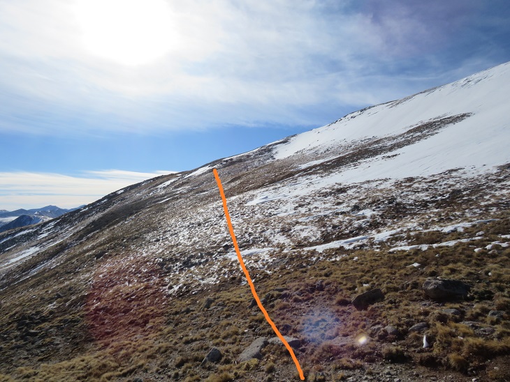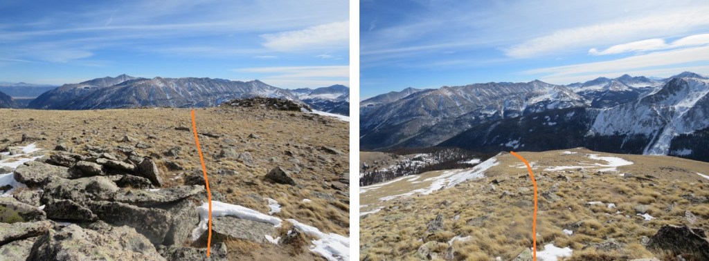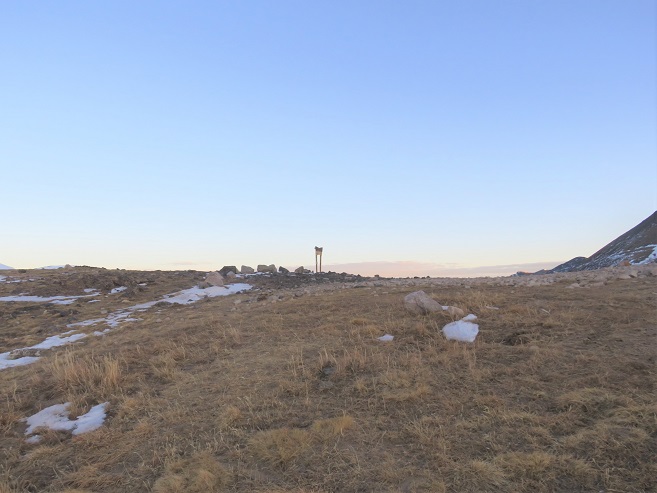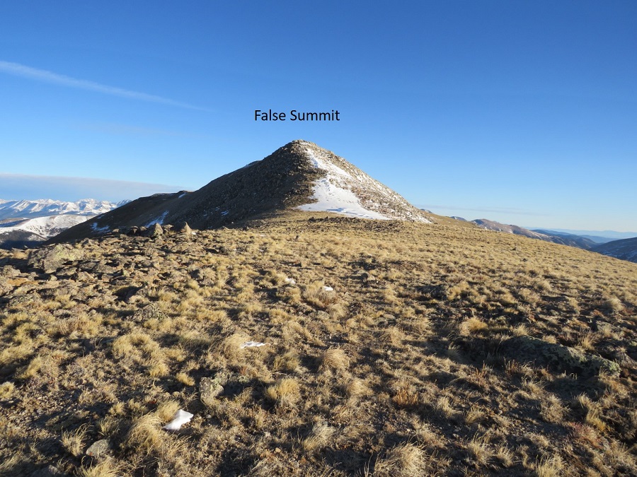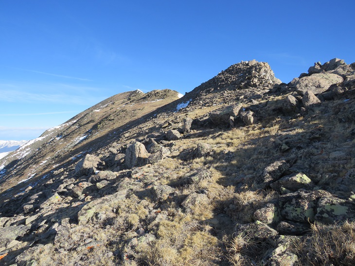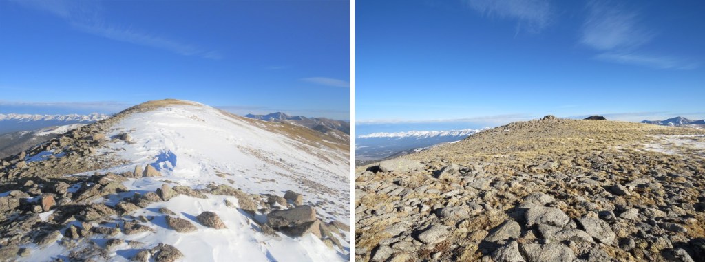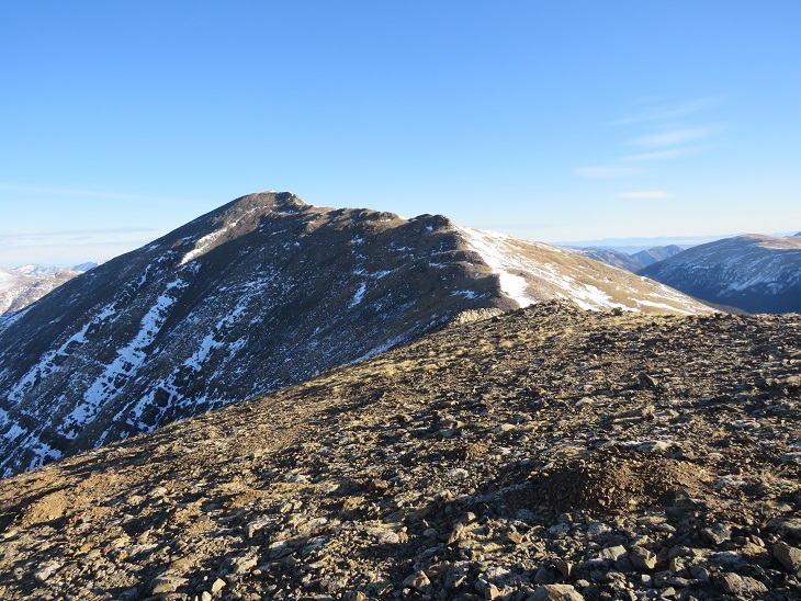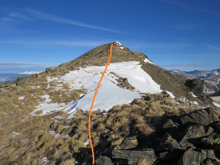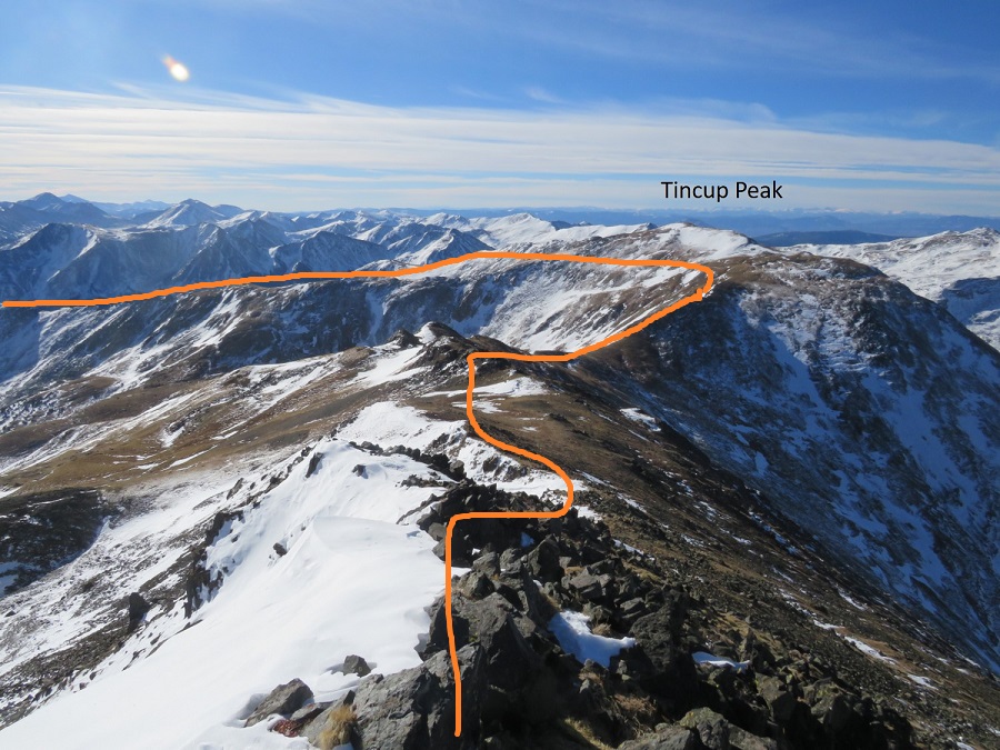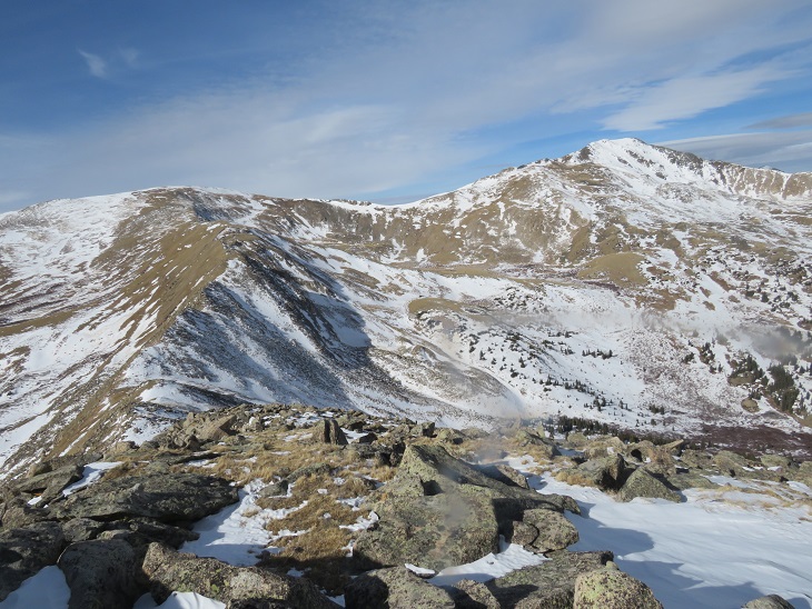 I traversed Tincup’s east slope to the ridge. Here the wind stopped and it was getting warm, so I was able to take my balaclava off.