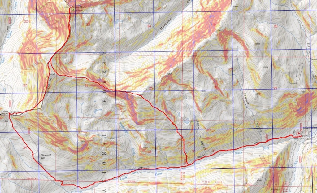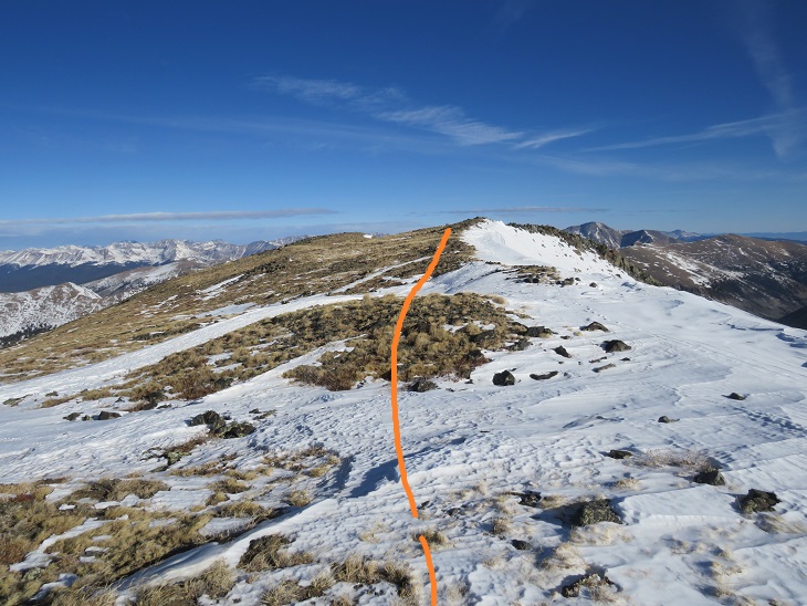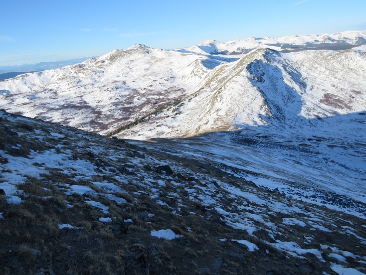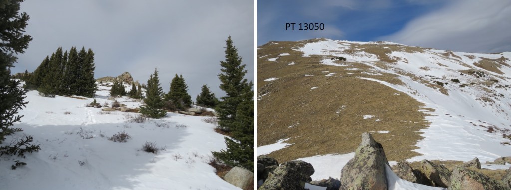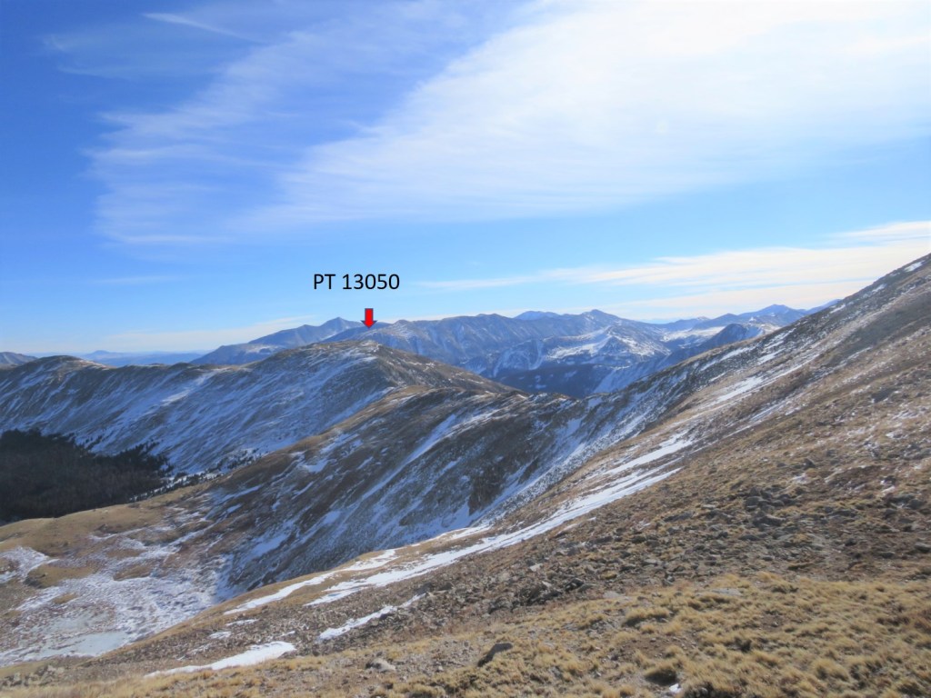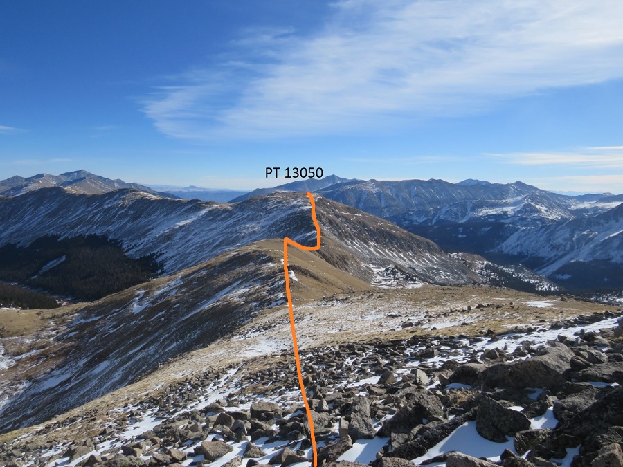 The day was still young and the forecasted snow hadn’t materialized, so I decided to make this a loop and head over to PT 13050. Here’s an overall view of my route to the ridge. I didn’t re-summit Tincup, but instead stayed just below snowline