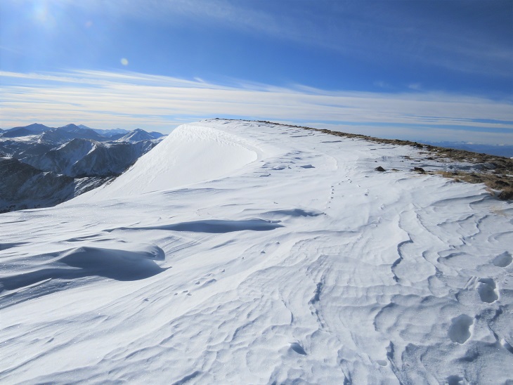 It was quite windy, so I didn’t stay on the summit long. Instead, I turned and headed back the way I’d come, towards Tincup Peak. Heading south now I had a great view of a cornice forming on Emma Burr