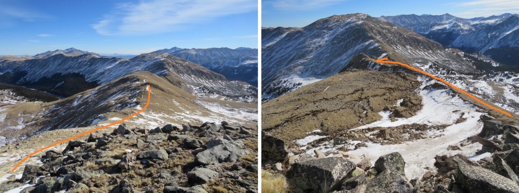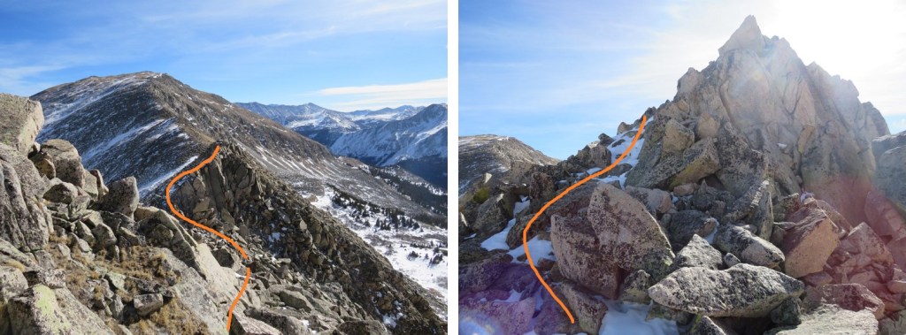Here are some step by step visuals of the ridge to Emma Burr. You can stay low here or go high. Both are class 2