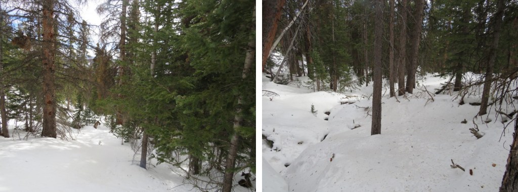 At this point I put on my snowshoes and aimed southeast, heading towards the 4WD road. Once in the trees I found a drainage and followed that down. This would not be fun to do in reverse.