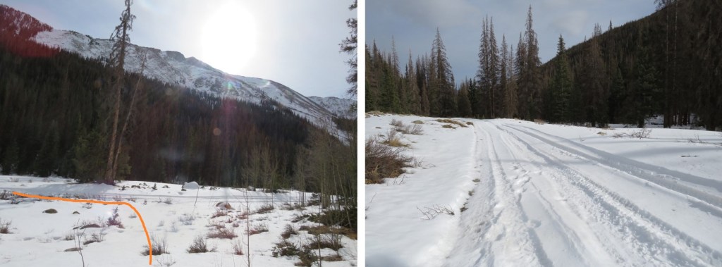 After hiking for just over 5 miles I made it to the upper basin. Just as with last week, here the tire tracks stopped. I donned my snowshoes and made my way northwest to Tincup Pass. I also noticed the snowshoe tracks I’d made last week were gone, and unfortunately, no moose sightings this time.
