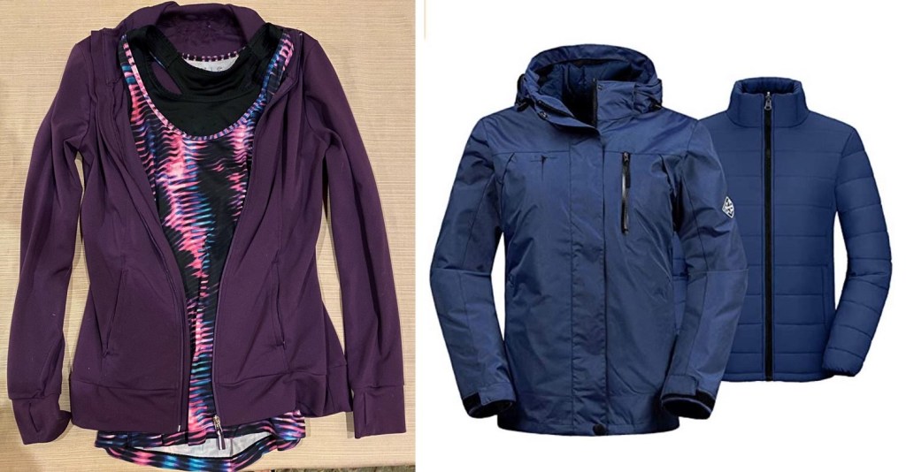 Upper Layers: I rarely take layers off during a hike, as I’d rather be too hot than too cold. With Raynaud’s it’s easy to cool off when hot, but difficult to warm up once cold. I wear a moisture wicking sports bra, tank, and jacket all the time, no matter what. On top of that I have a puffy and a shell (the shell doubles as a rain jacket). The shell has a hood, which I have prepped to fit my head if needed to block out the wind.