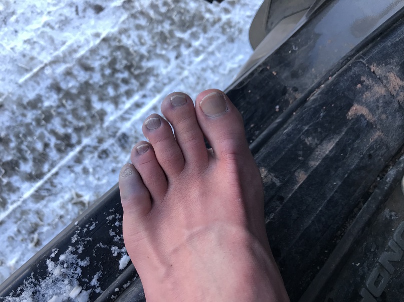 During an attack of Raynaud’s, affected areas of your skin usually first turn white. Then, they often turn blue and feel cold and numb. As you warm and your circulation improves, the affected areas may turn red, throb, tingle or swell. This can be a very painful experience. Many people mistake it for frostbite. This time I’d earned my blue toes, as I’d been snow-shoeing without the proper gear