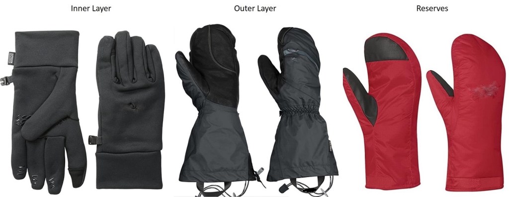 I bring along 3 pairs of gloves: I wear two at a time, and have the third in reserve in case I loose one I’m wearing: The wind above treeline can be ferocious, and I’ve seen gloves blow away in the wind. If you have Raynaud’s and you lose a glove above treeline it’s quite possible you’ll be losing fingers with it. I buy all gloves one size bigger than I normally wear. This allows for my hands to swell at altitude and makes them easier to put on/take off as needed.