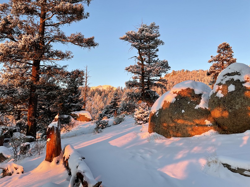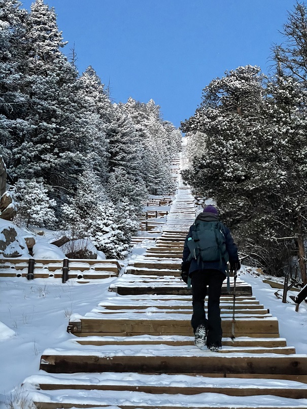 I haven’t been to the Manitou Springs Incline since they’ve implemented the reservation system, but since there was high avalanche danger all across the state, I figured today was a good day to go. The reservations were free, and easy to obtain. There are 25 slots open every half hour for reservation, and I secured the last two. However, when we arrived we only passed/say about 8 other people all day, and no one was enforcing the permit system. Maybe they took a snow day?