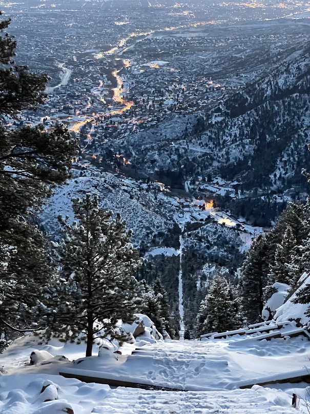 We paid to park while it was still dark and headed up the trail. It was 12 degrees outside, and SkyDiverHiker had on his new gloves. We weren’t sure if we were going to hike the incline once or twice today, so we decided to take it slow. We also wanted to see the sunrise, and we knew at our normal speed we’d get there half an hour before it happened, so if we went a little slower we’d stay warm longer. Check out our view of Manitou Springs