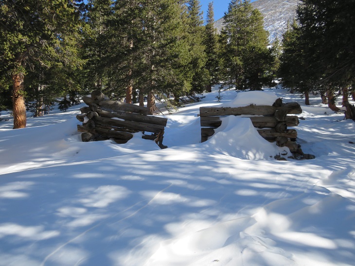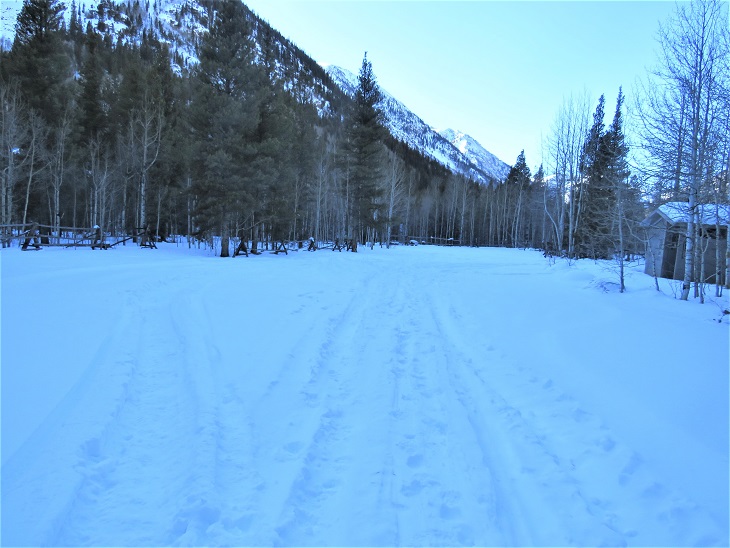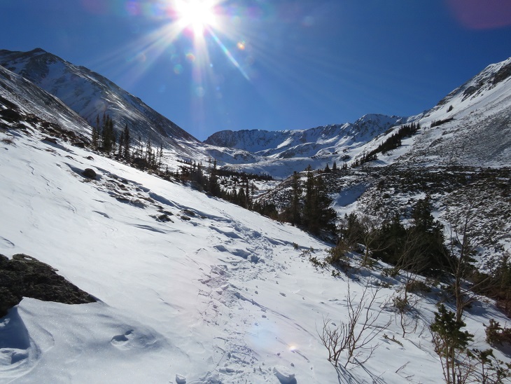 As we warmed up our spirits lifted and we were once again thrilled to be out here hiking.  This is one of the most beautiful places in Colorado to hike, and we had it all to ourselves.  Well, it was us and the chirping ptarmigans.  We hiked back past the cabin and through the avalanche area, took off our snowshoes, and continued back to the trailhead in better spirits.  Yes, this is a mental game.