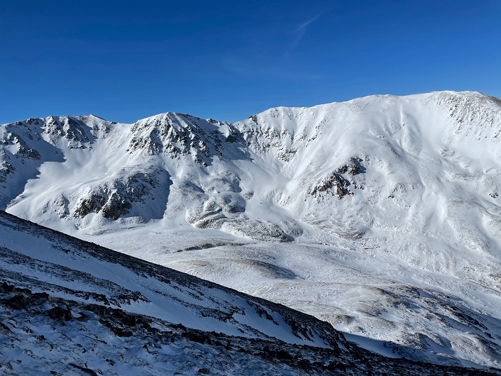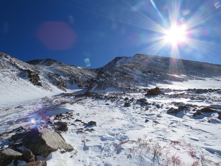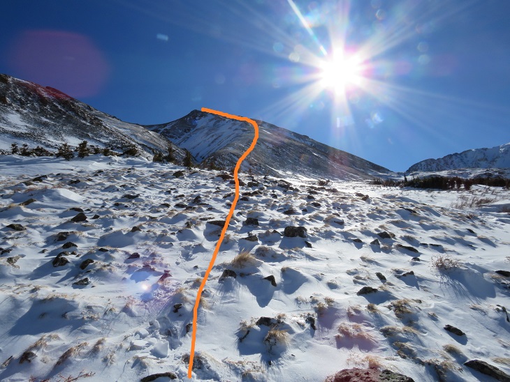 Once past the cabin the trench stopped again.  The wind in the gulch is fierce and I’m sure blows away trenches nightly that are made during the day.  No worries though, we just headed through the gulch (still wearing our snowshoes) towards Mt Belford’s Northwest Ridge
