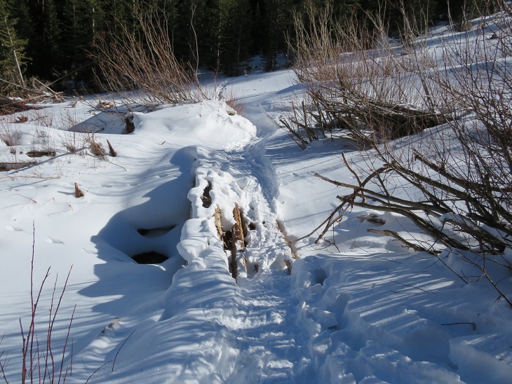 Once in the avalanche area the trench stopped.  We crossed the drainage on some sketchy, snow covered logs