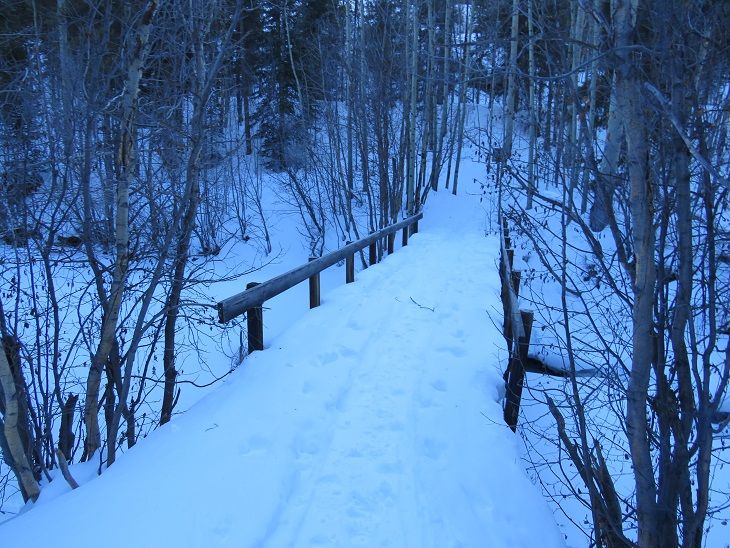 We crossed clear creek and started ascending the side of the mountain wearing microspikes.  We saw some elk tracks here, but luckily, no mountain lion tracks this time.