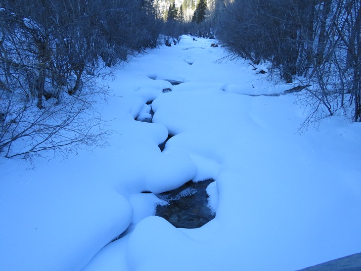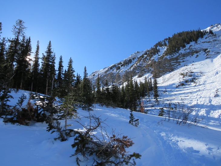The screaming and crying continued until we made it to where we were hiking in sunlight, near the base of the ridge.  It’s amazing how the warmth of the sun made me feel better, even when it was still well below freezing. Once at the base of the ridge we donned our snowshoes once again and headed back out of the gulch, following our morning trail.