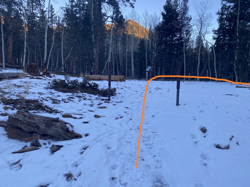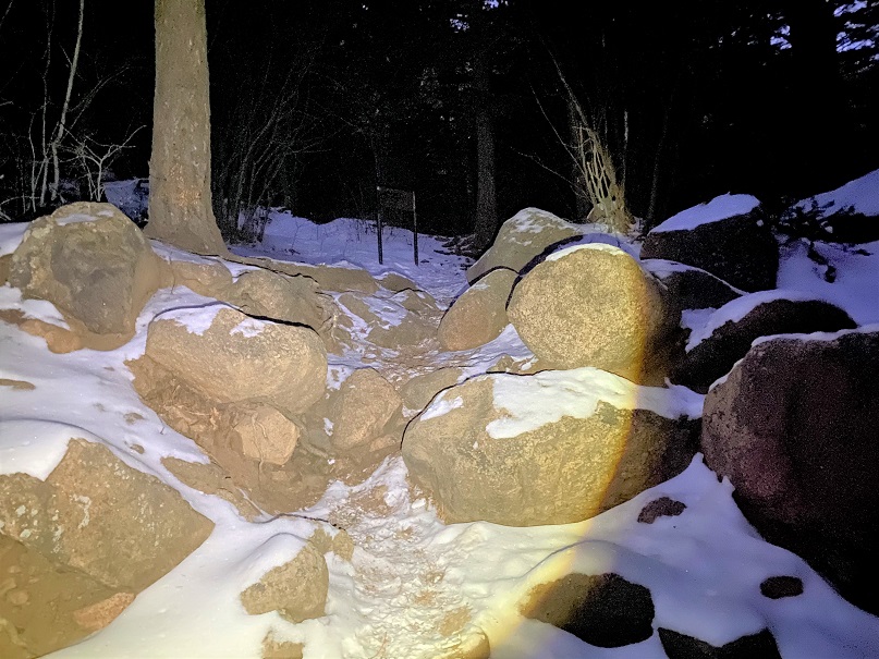I put on my microspikes and wore them the entire way. I was on the trail at 6am, happy not to be lugging along my snowshoes for the first time this winter. The trail starts at the west end of the parking area.