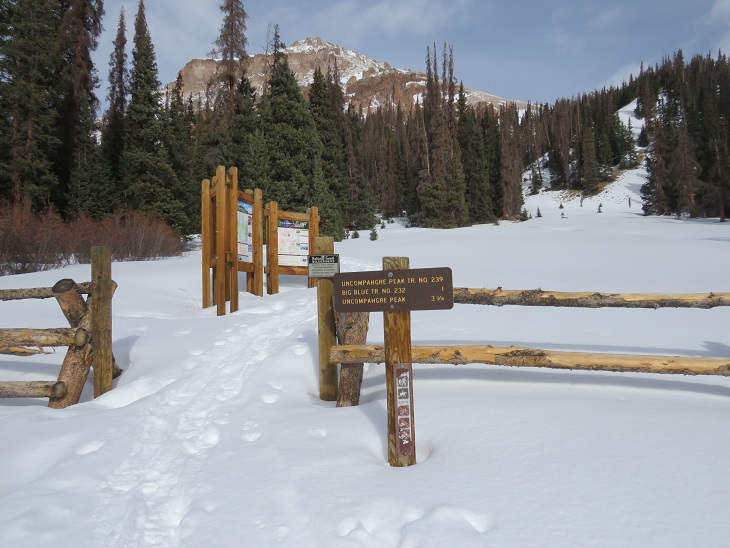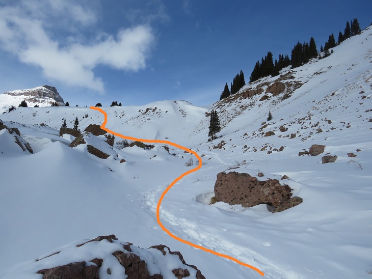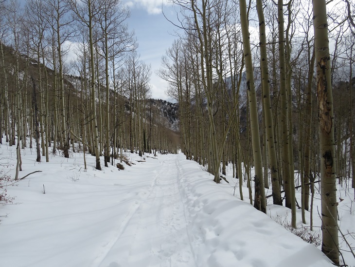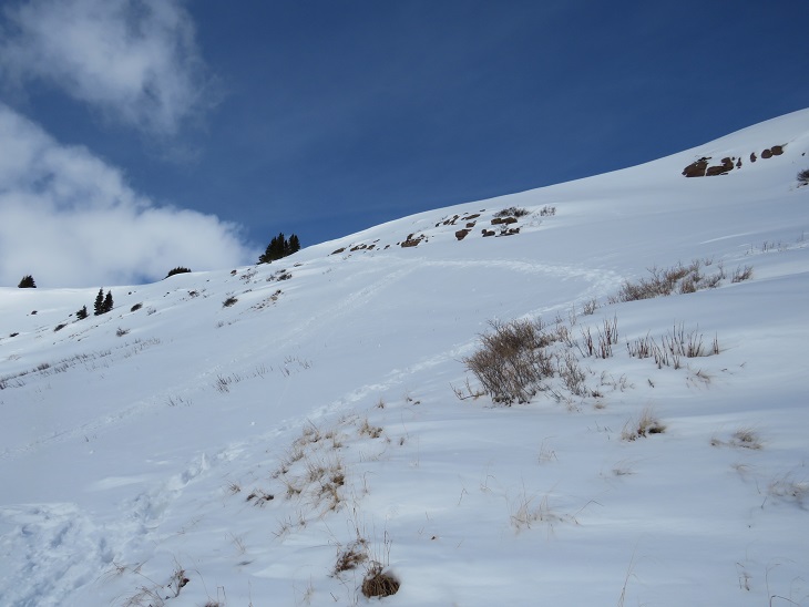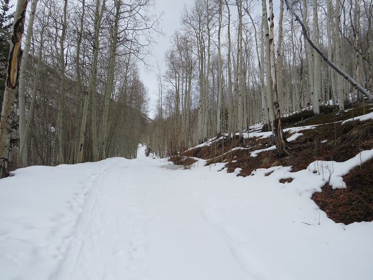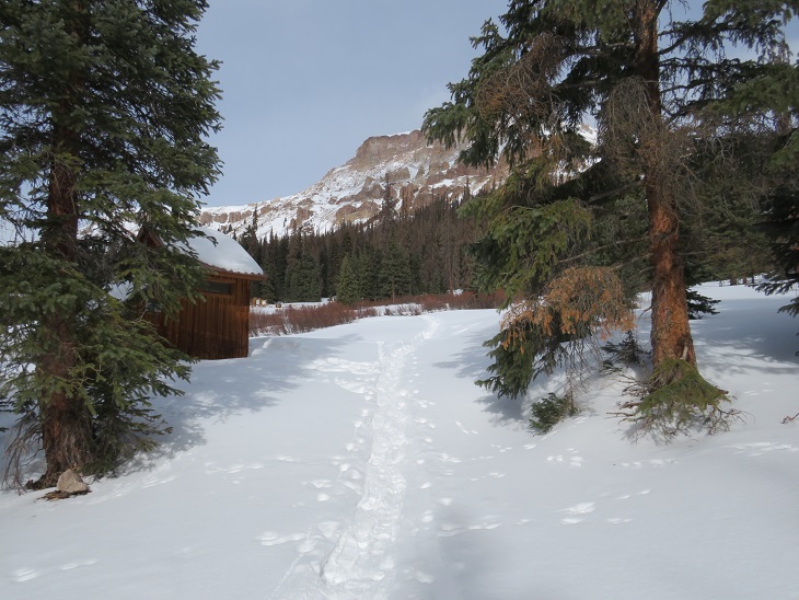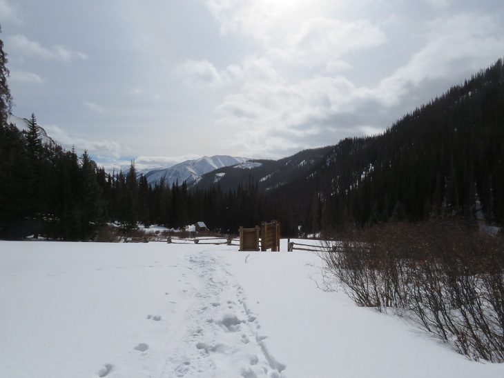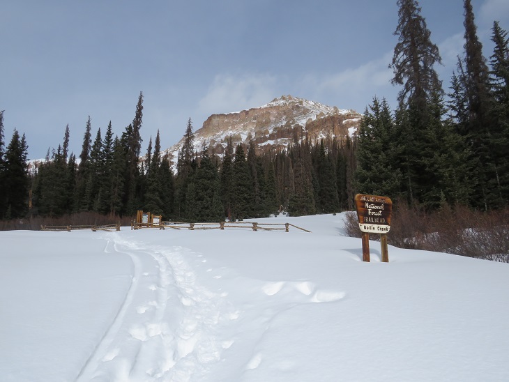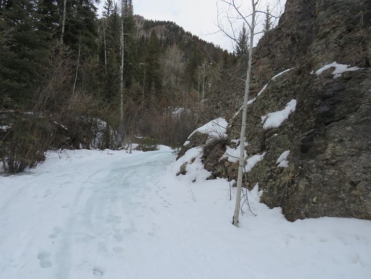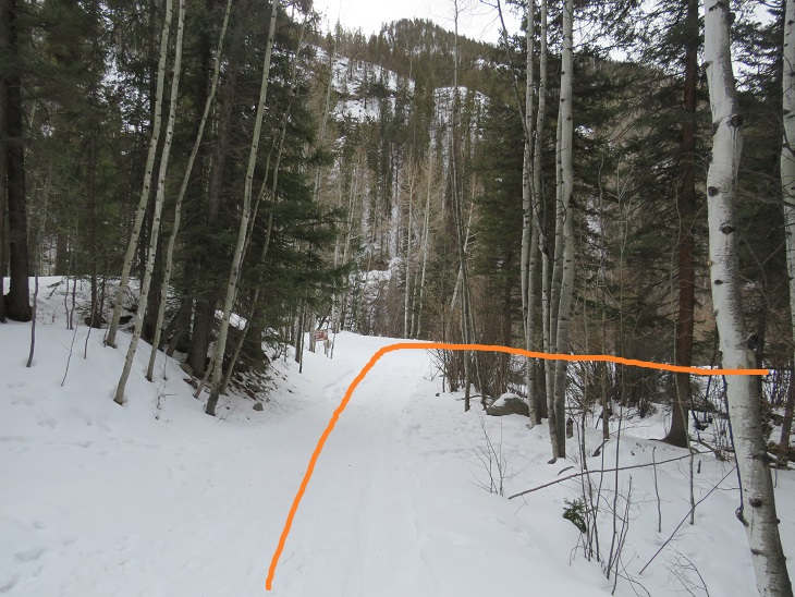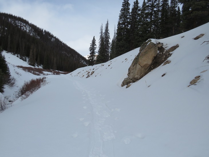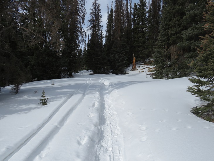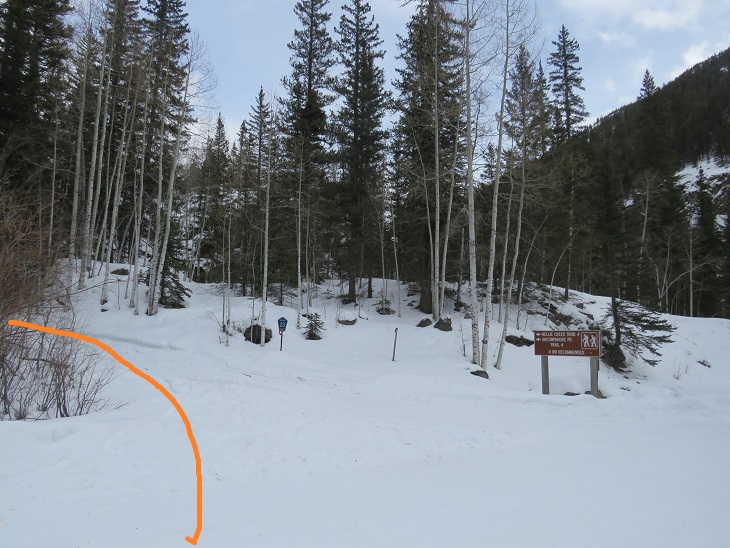 This is where the trail got ‘iffy’. There was no longer a trench, but if I strayed from the old trench I’d sink up to my waist in snow. I put on my snowshoes and only postholed every 30 steps or so. Here’s the upper trailhead
