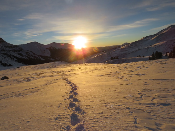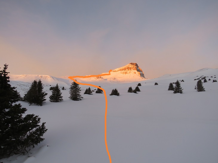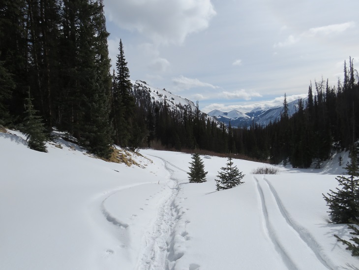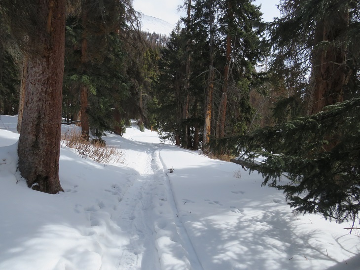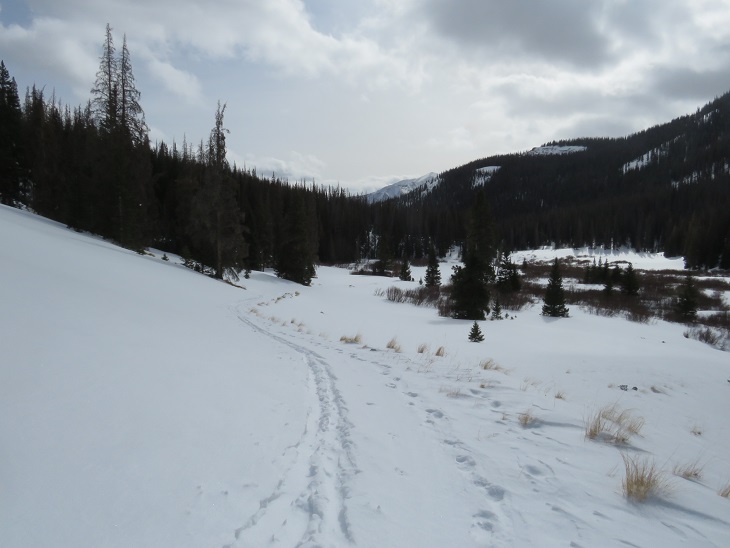 From this point it was clear he’d been trenching with his skis, but even so, I didn’t need to put on snowshoes until I made it to treeline. I continued hiking along the road
