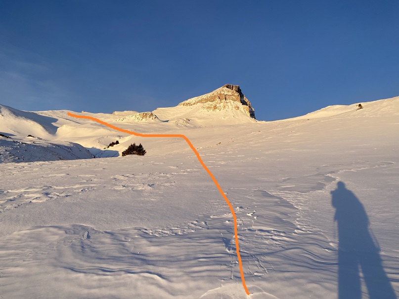I took off my snowshoes at the gully and climbed up, carrying them (bad idea)